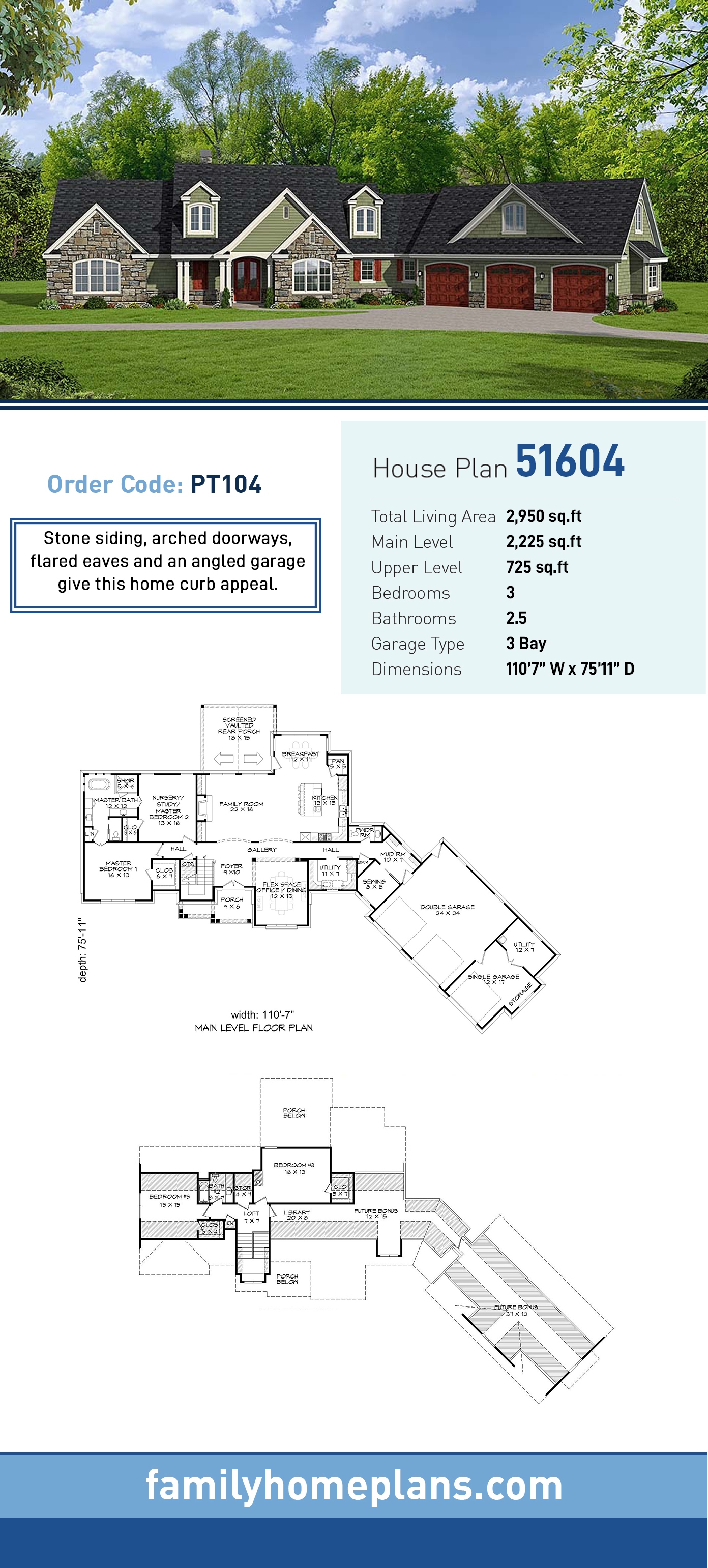 Country, Craftsman Style House Plan 51604 with 2950 Sq Ft, 3 Bed, 3 Bath, 3 Car Garage