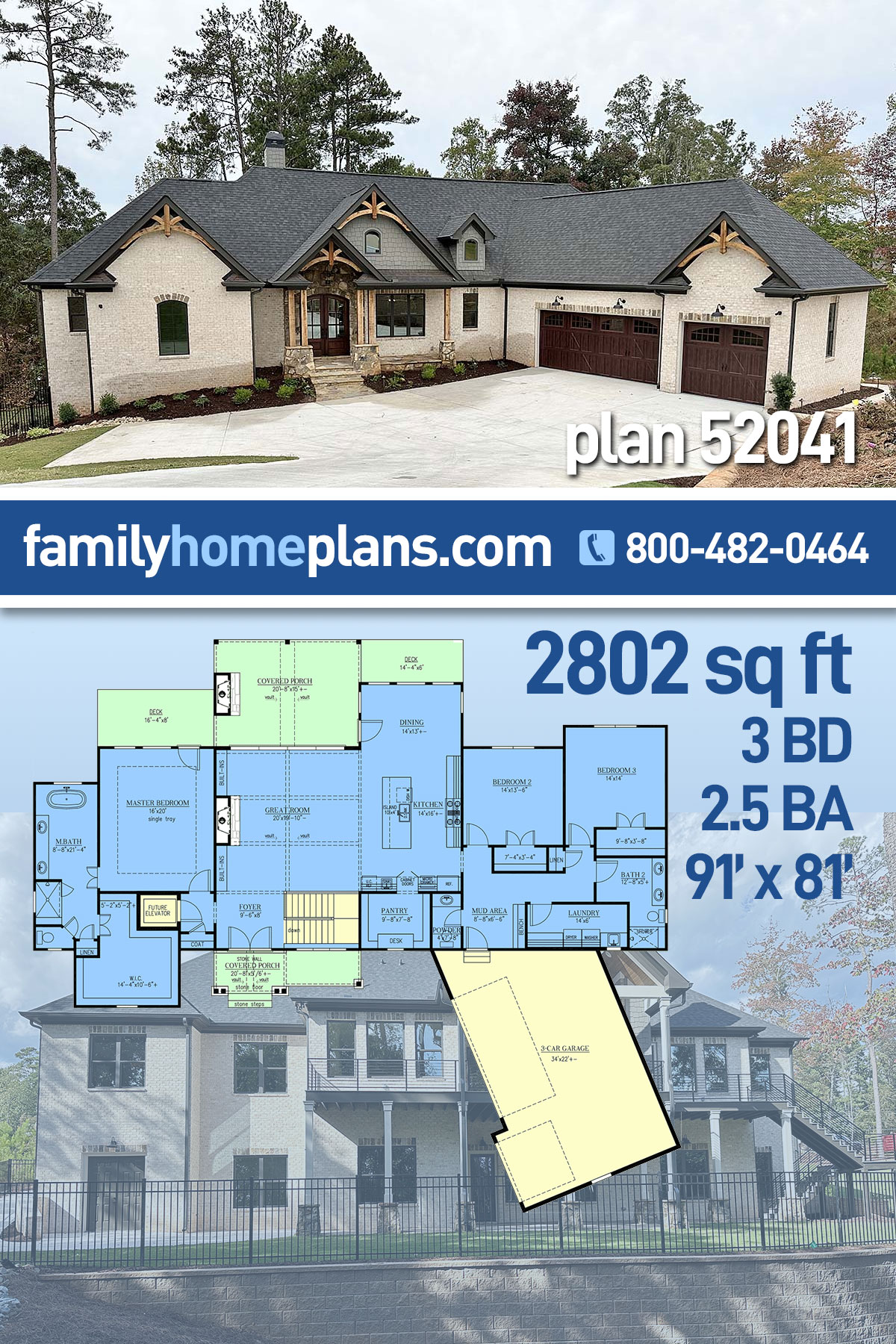 New American Style, 2802 Sq Ft, 3 Bed, 3 Bath, 3 Car | Plan 52041