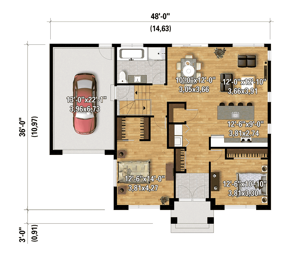 This one-story chic urban-style Modern Bungalow House Plan offers 1,208 sq. ft. of living space and a one-car garage. Choose stone siding and wood to create this contemporary look. The interior is open-concept and includes a kitchen with an island for four people along with a walk-in pantry to store your supplies, a dining room beside a set of sliding doors, and a comfortable living room. One full bathroom serves this home with both a bathtub and a separate shower. Laundry is accommodated by the closet close to the front entrance. There are also two bedrooms, and the master bedroom has a walk-in closet. The frontage is 48 feet and the depth is 39 feet.