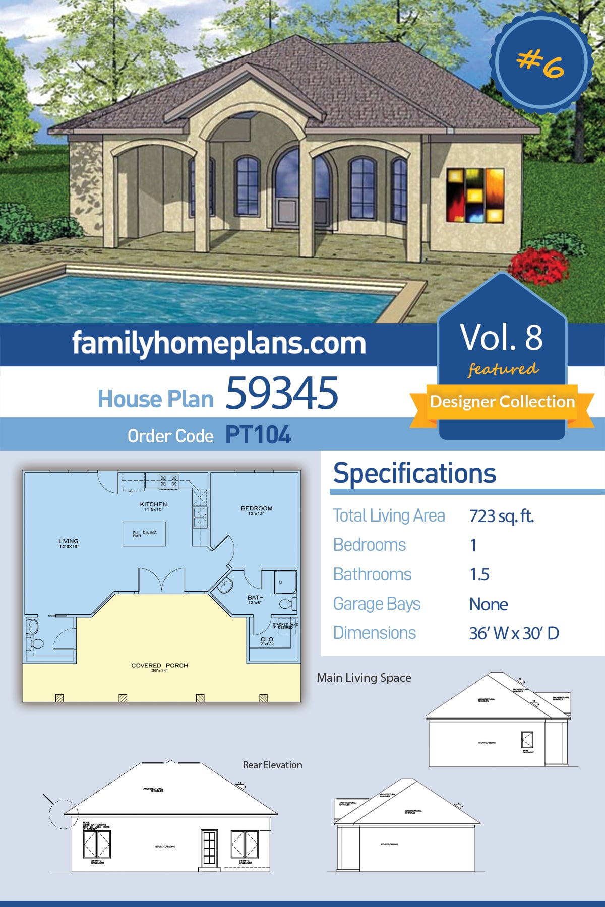 Tiny house plan with a 723 square foot floor plan, one bedroom and 1.5 bathrooms. An open floor plan in the living space with a full kitchen and even a kitchen island or dining bar. A deep front covered porch with access to the half bath from outside the house. We have sold this design as a pool house, a guest house, a getaway house / second home, a fishing cabin and a tiny house plan to get away from the big city. The design style for this micro floor plan is European.