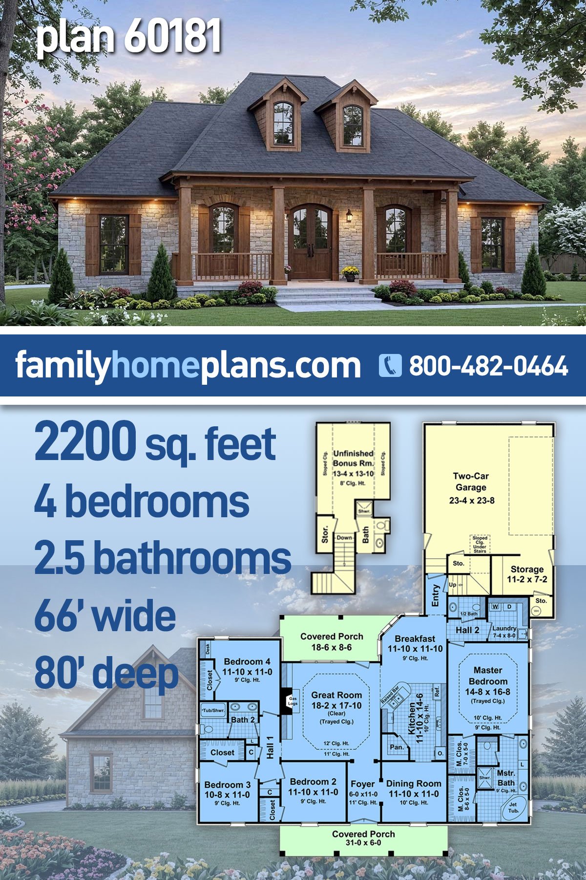 Acadian / French Country House Plan 60181 – 4 Bed, 3 Bath, 2-Car Garage with Bonus Room