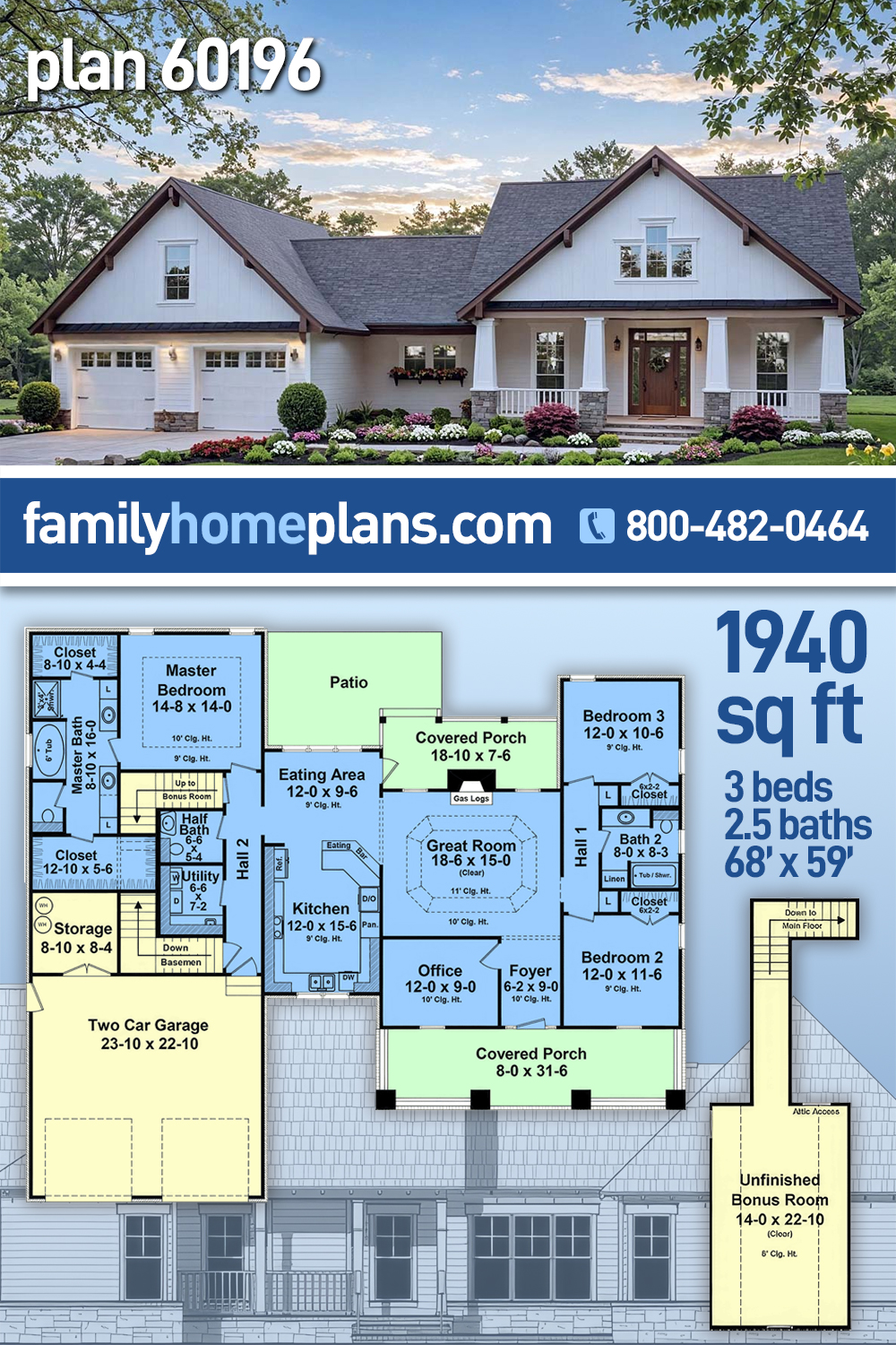 Craftsman Farmhouse Plan With Split Floor Plan 60196 offers 1,940 sq ft of inviting living space with 3 bedrooms and 2.5 bathrooms. A covered front porch and front-facing two-car garage create classic curb appeal, while an optional bonus room above the garage allows room to grow. Inside, the foyer opens to a private office and leads into a great room with a striking ceiling feature and gas log fireplace. The sunny eating area connects to the kitchen with angled eating bar and opens to a covered porch and patio. Two secondary bedrooms share a hall bath, while the private primary suite includes dual walk-in closets and a spa-style bath. A utility room, half bath, and large garage storage area add everyday convenience.
