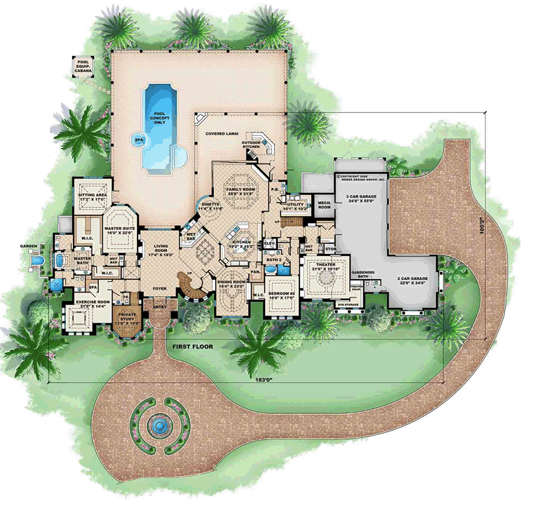 Mediterranean Style House Plan 60577 with 10875 Sq Ft, 5 Bed, 8 Bath, 5 Car Garage