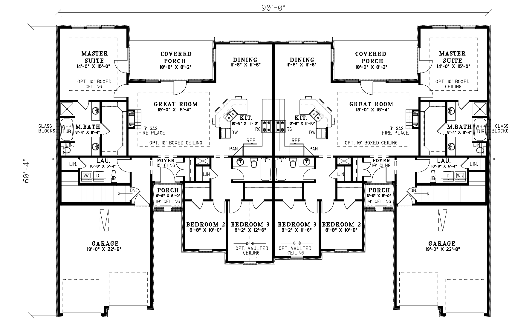 One-Story Style Multi-Family Plan 62351 with 1481 Sq Ft, 6 Bed, 4 Bath, 4 Car Garage