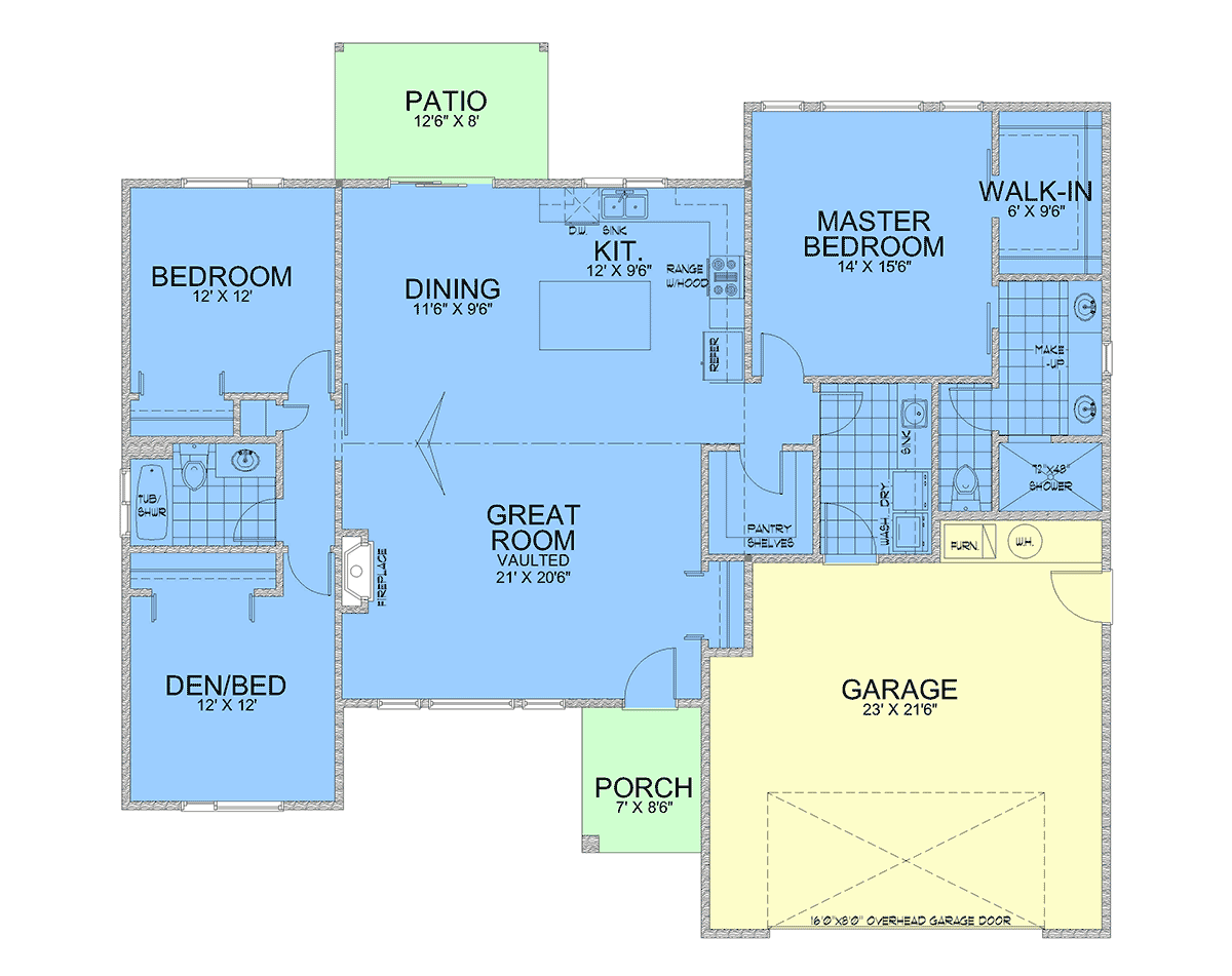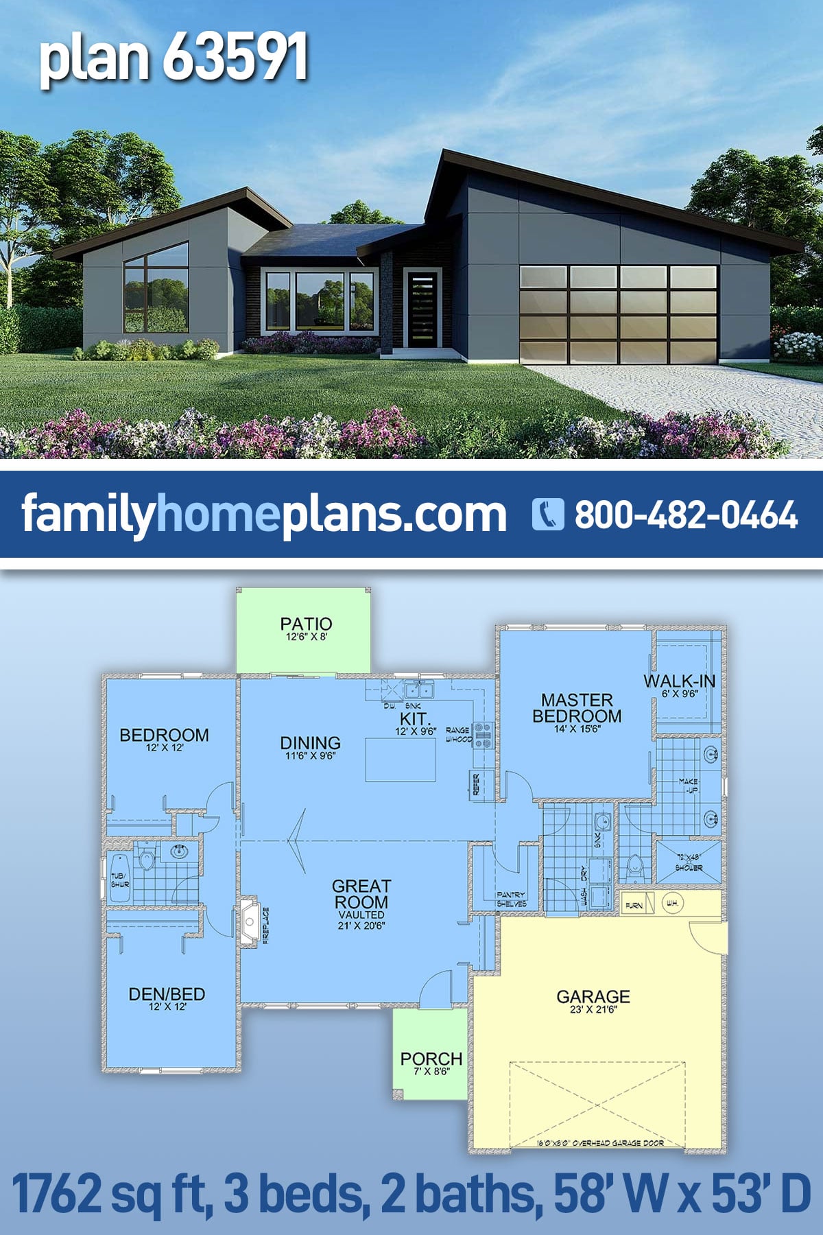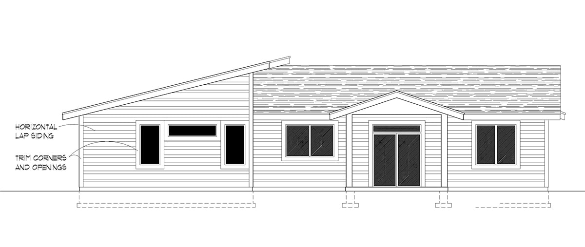 Modern Style House Plan With Vaulted Ceiling # 63591 is the perfect size with 1,762 sq ft of living space, 3 beds, 2 baths, and a 2 car garage. The contemporary exterior features a glass garage door, big windows, and angled rooflines. Inside, the front door opens to a large great room, dining area, and kitchen, all of which benefit from the vaulted ceiling. The kitchen has plenty of workspace because of the island, and there's a walk-in pantry and spacious laundry room nearby. Mom and Dad will appreciate the amenities of the master bedroom including a 6' x 9.5' WIC and bathroom with private water closet. Two children's bedrooms and a guest bath complete this design.