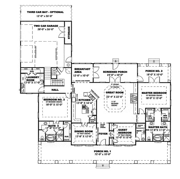 Dual Master Bedrooms with FULL spa baths and walk-in closets, make this plan unique. The second Master could be used for the Grandparents, Guests or that boomerang child. Each bedroom ceiling is recessed to 10' for an elegant open feeling. The Master Bedroom has a wide covered porch accessed by double French doors.