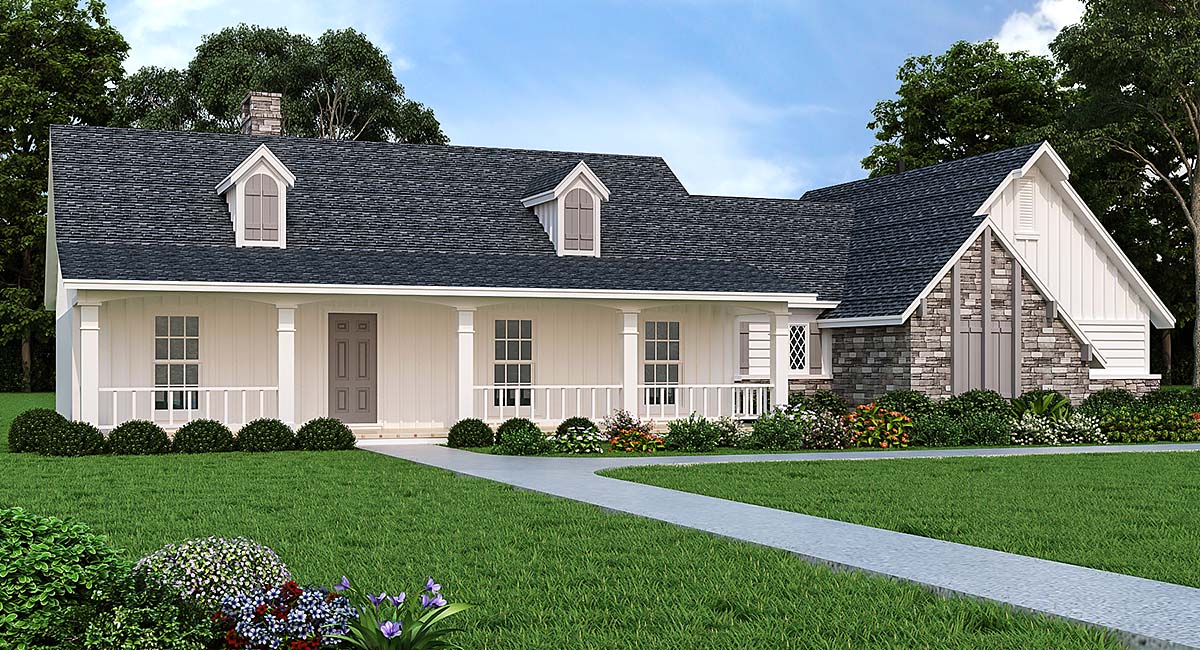 Rustic charm highlights the exterior of this design, while the interior is filled with all the latest comforts. The wide, covered porch opens to a roomy entry, where two 7-ft.-high openings with decorative railings view into the dining room. Straight ahead lies the sunken living room, which features a 16-ft.-high vaulted ceiling with exposed beams. The fireplace is faced with floor-to-ceiling fieldstone, adding to the rustic look. A rear door opens to a large patio with twin plant areas. The large U-shaped kitchen has such nice extras as a china niche with glass shelves. The secluded master suite hosts a sunken sleeping area with built-in bookshelves. One step up is a cozy sitting area that is outlined by brick columns and a railed room divider. Double doors open to the deluxe bath, which offers a niche with glass shelves.