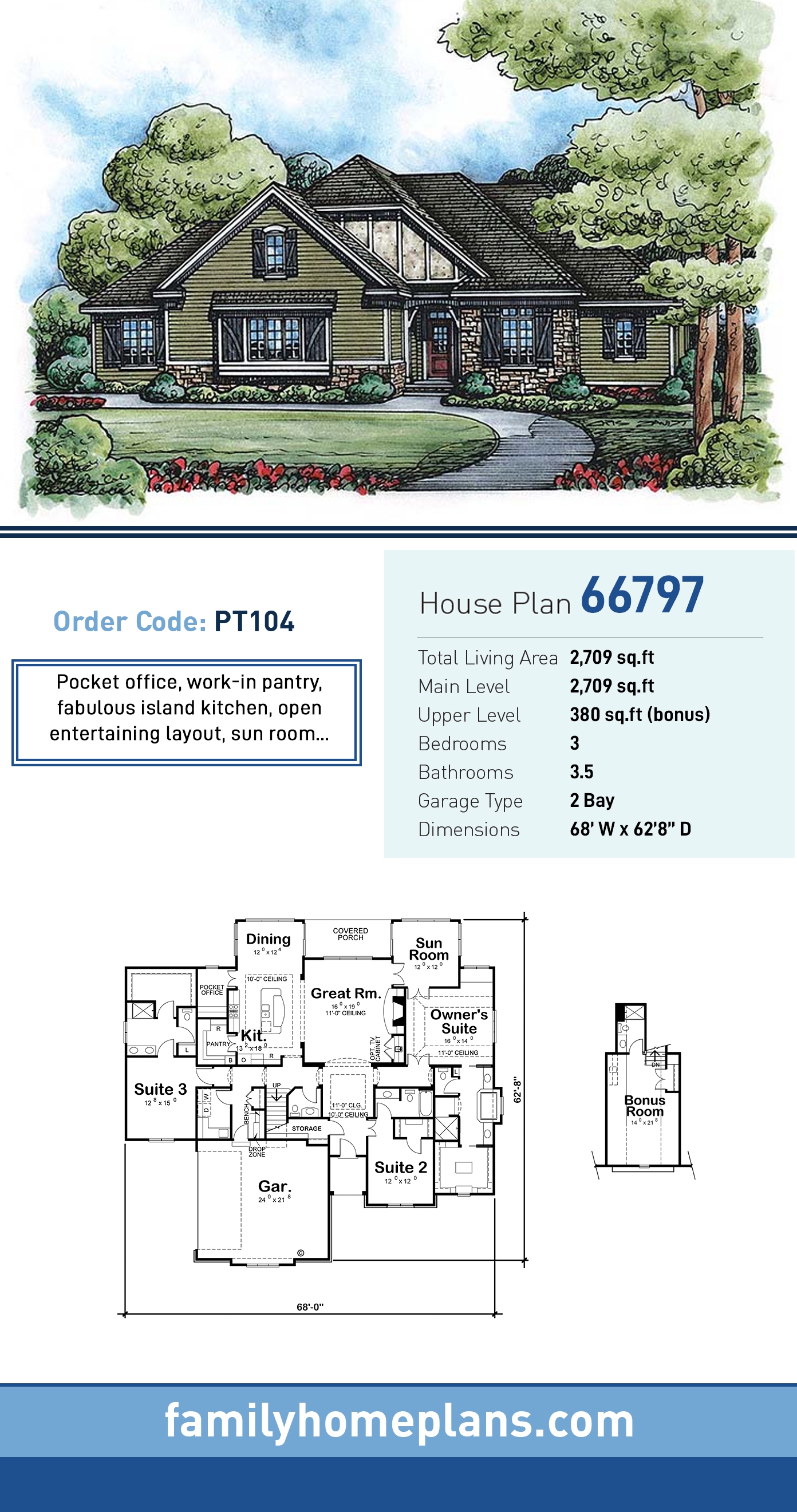 What an amazing home! Pocket office…work-in pantry…fabulous island kitchen…open entertaining layout…sun room with dual access (wouldn’t that make an inspiring studio for the artist or writer at heart?)… fanciful owner’s suite with its must-see bathroom and island walk-in closet. And whether used for a married couple with separate sleeping needs, two non-related adults, or for a live-in relative, with dual master bedrooms this design is perfect for a variety of lifestyle needs and choices.