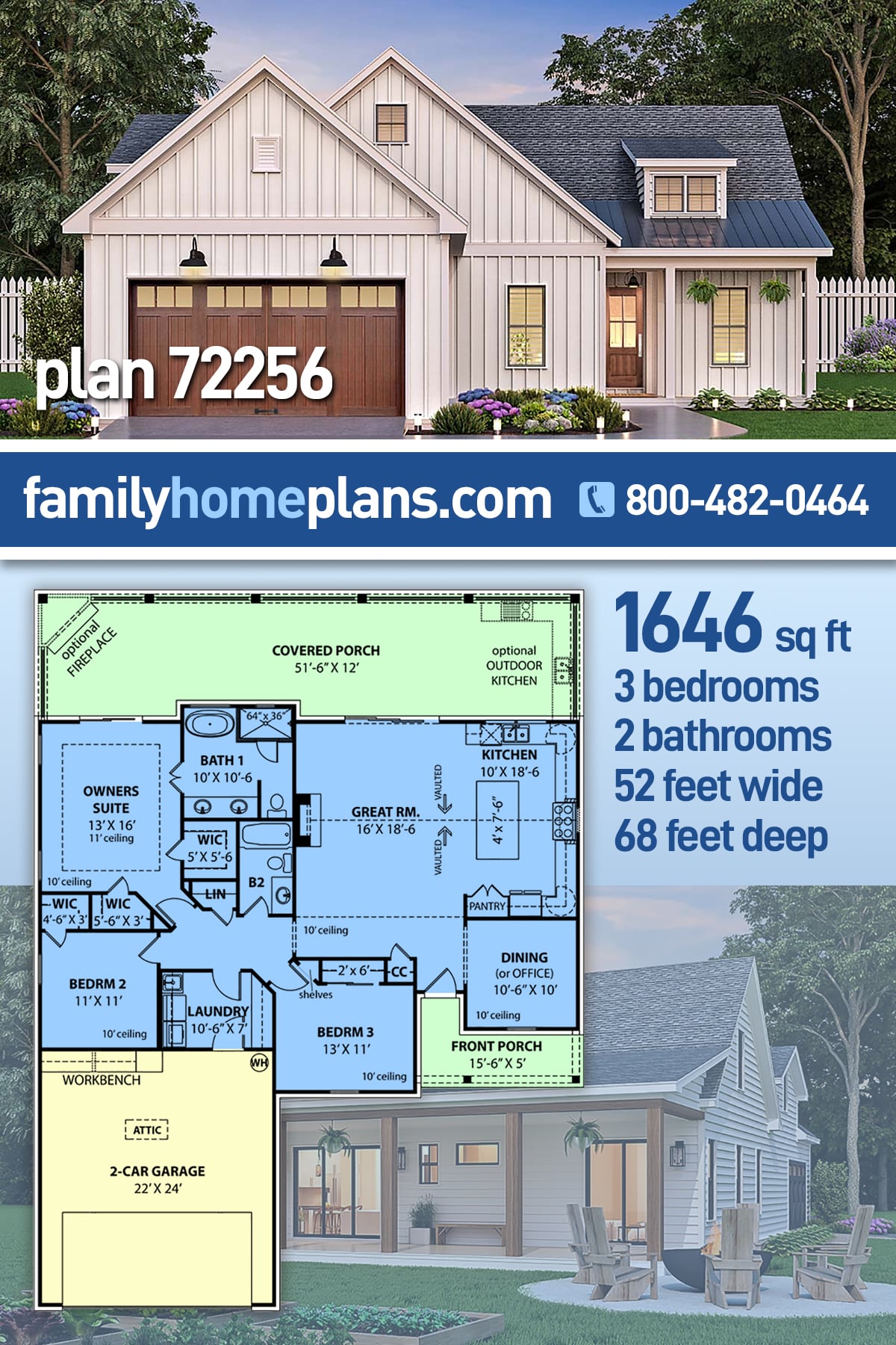 The New American House Plan With Giant Back Covered Porch (Plan 72256) delivers 1,646 sq. ft. of easygoing one-story living with 3 bedrooms and 2 bathrooms, designed to shine outdoors. Crisp vertical white siding and a modest front porch give way to a showstopping rear porch stretching 51.5 feet wide and 12 feet deep, with options for a fireplace and outdoor kitchen. Inside, a flexible dining room or office leads to a vaulted great room that opens to a kitchen with a generous island and sliding doors to the porch. Two secondary bedrooms sit to the left near a hall bath and a walk-through laundry to the garage. The owner’s suite features an 11-foot ceiling, dual walk-in closets, a spacious bath with double sinks, and private porch access.