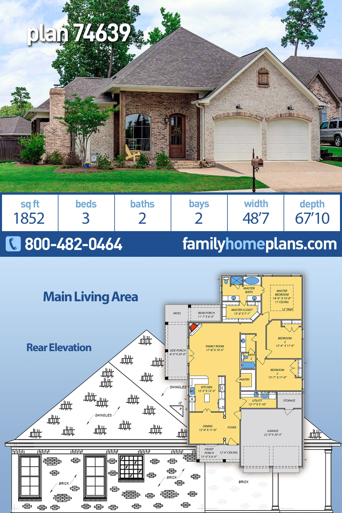 Traditional Style, 1852 Sq Ft, 3 Bed, 2 Bath, 2 Car | Plan 74639