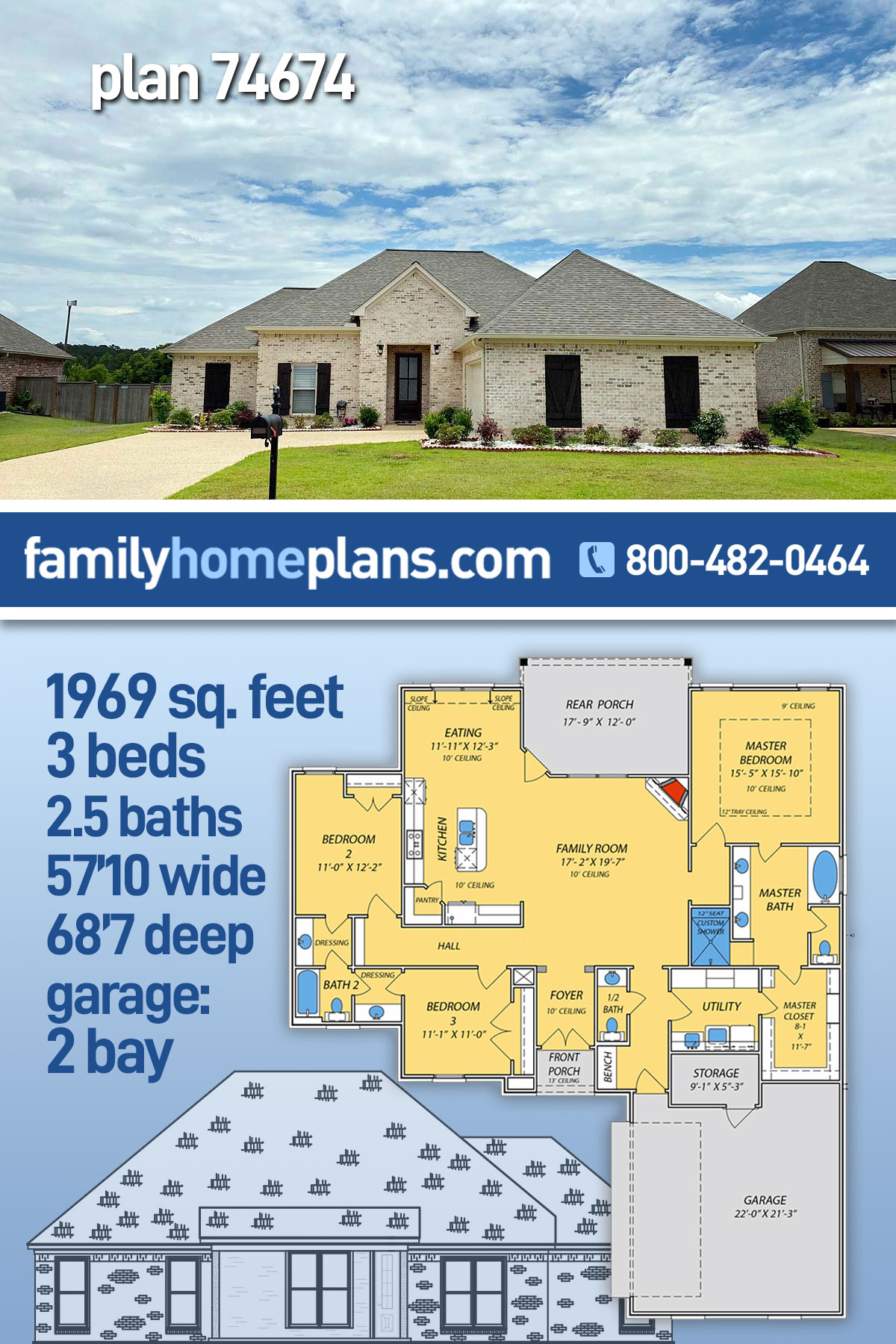 French Country, Traditional Style House Plan 74674 with 1969 Sq Ft, 3 Bed, 3 Bath, 2 Car Garage