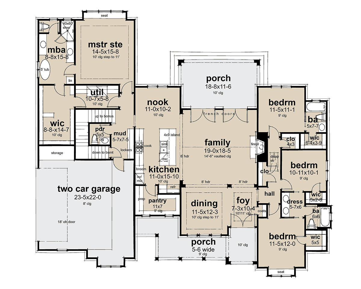 We offer a choice of three types of foundations, full basement, crawlspace, and slab foundations. Each comes fully dimensioned, and noted indicating wall composition and thickness, construction detail references to our detail page, beam, pier and column locations and sizes, stair locations for basements, reinforcing steel sizes and step downs in monolithic slabs and ventilation grilles for crawlspaces.