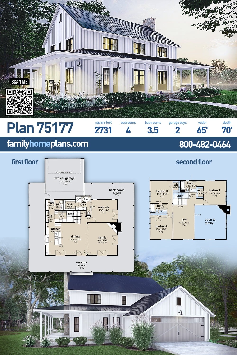 Discover the charm and spaciousness of House Plan 75177, a stunning Country Farmhouse Southern house plan offering 2,731 square feet of comfortable living space. This two-story design boasts 4 bedrooms, 3 full bathrooms, 1 half bath, and a generous 2-car attached garage, making it ideal for growing families or those who love to entertain.