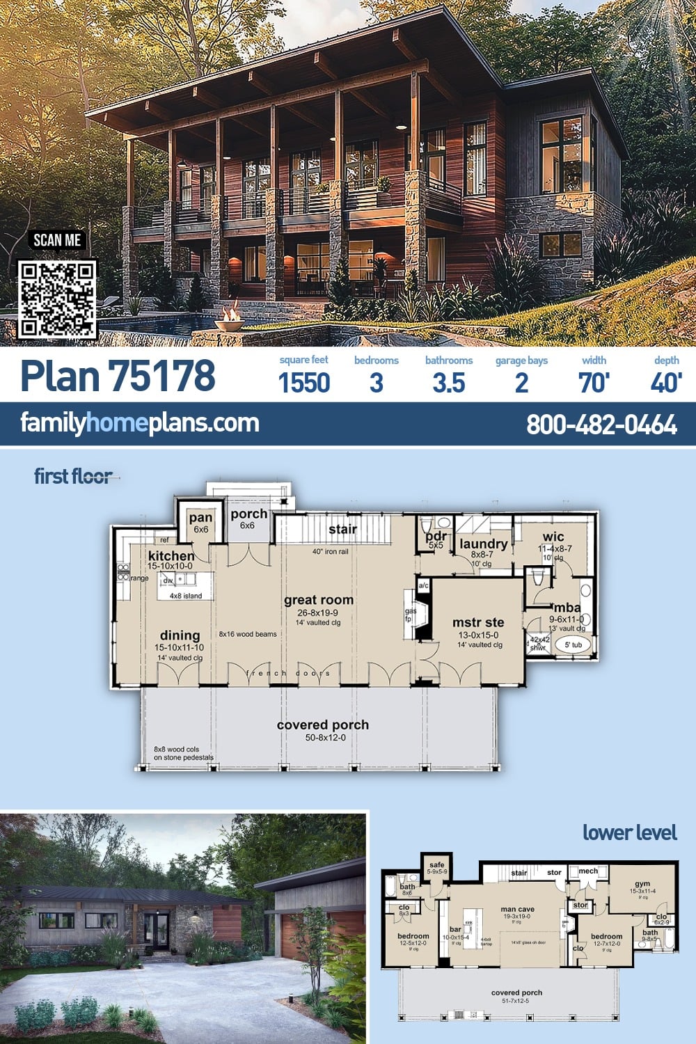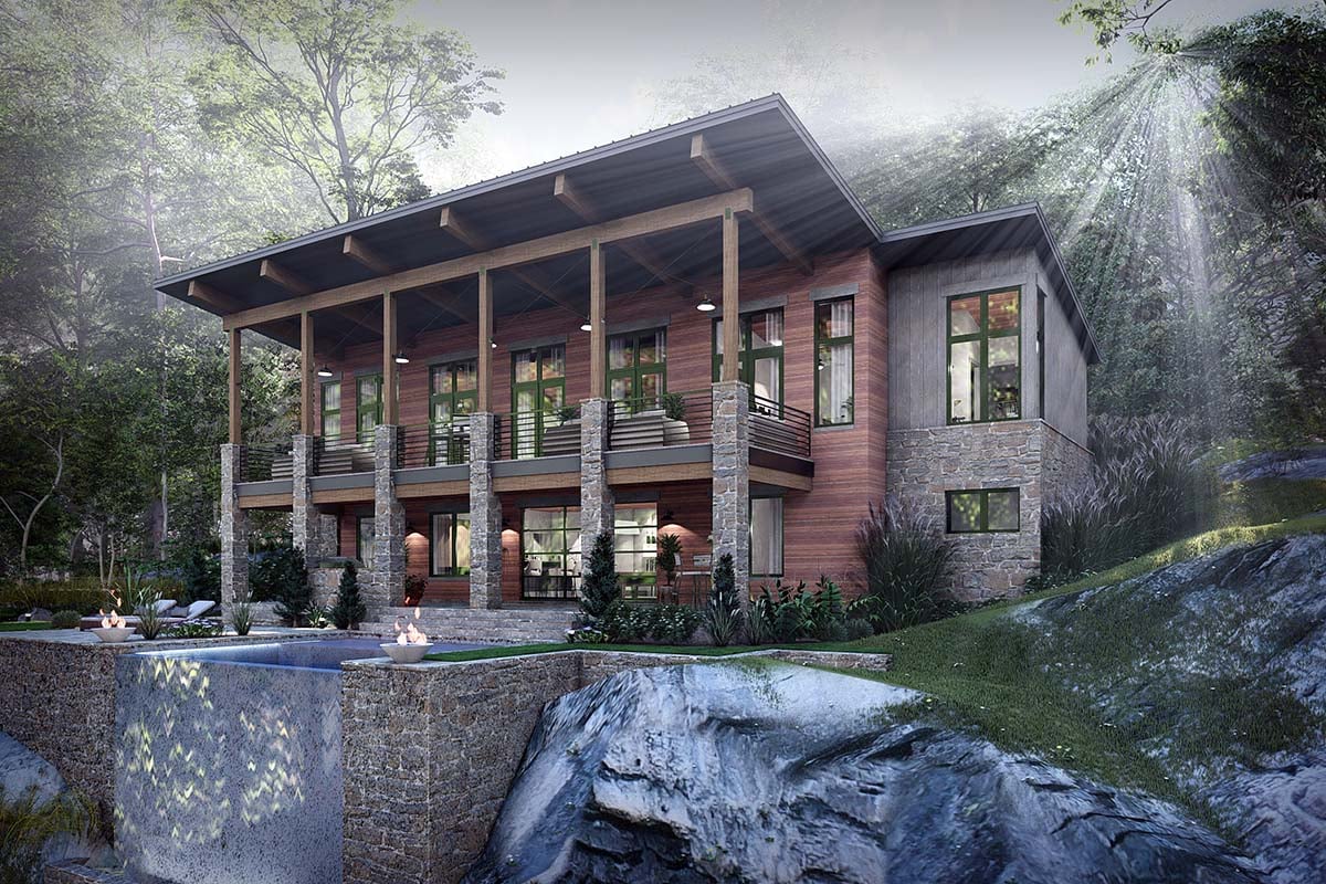Cabin Contemporary Modern House Plan 75178 with 1,550 Sq Ft, 3 Bed, 3.5 Bath, 2 Car Garage