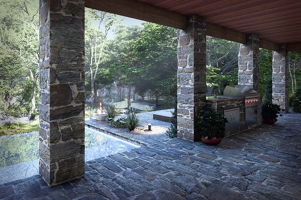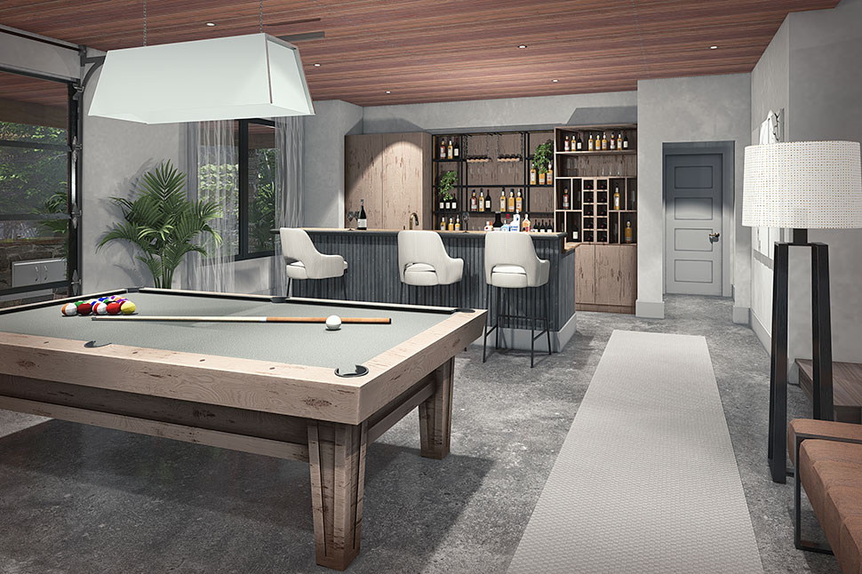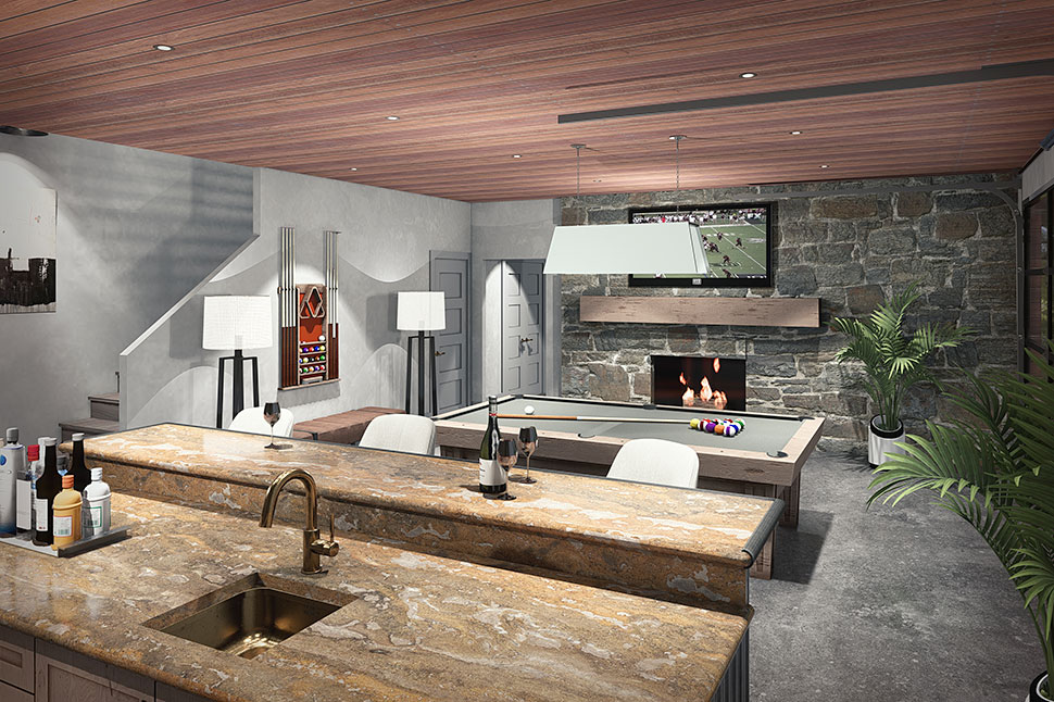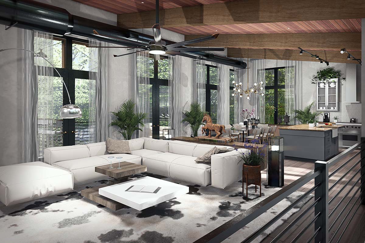 The exterior of this home plan exudes modern curb appeal with a wide 69'7" footprint and striking contemporary lines. Expansive front and rear porches—totaling over 1,250 sq ft—invite you to relax outdoors, providing the perfect spot for morning coffee or evening gatherings. The generous use of windows ensures plenty of natural light, while the low-profile roofline and modern detailing create a sleek, welcoming façade.