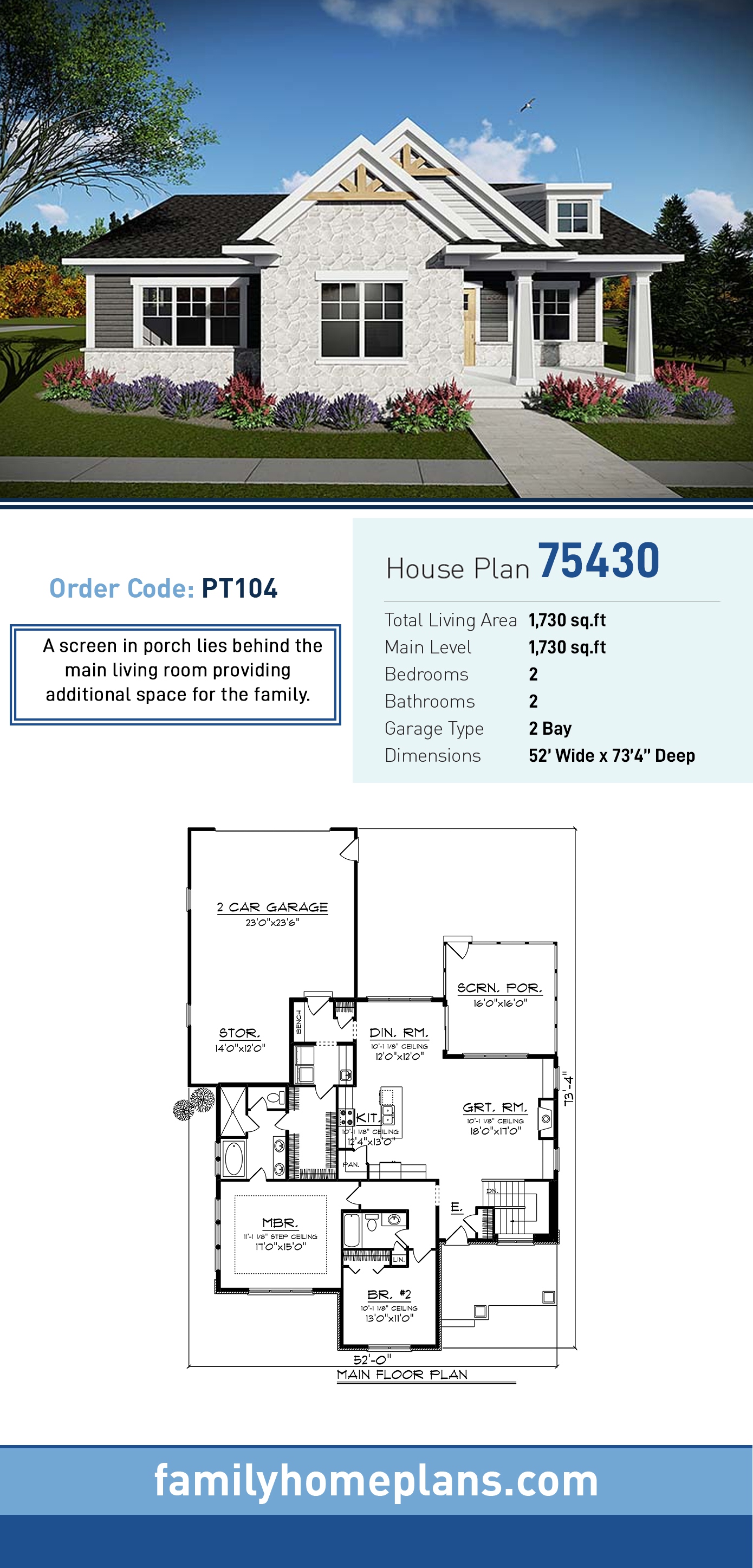 This two bedroom modern version of a classic craftsman style home features a stone and siding that look perfect together. As you enter the home, the main living room area lies to the right where the kitchen and dining all blend together to create an open plan with plenty of volume. A screen in porch lies behind the main living room that provides some additional space for the family. Behind the house a two-stall garage is located with extra storage as well. A screen in porch right off of the dining room fits the whole family to have a nice summer dinner outside.