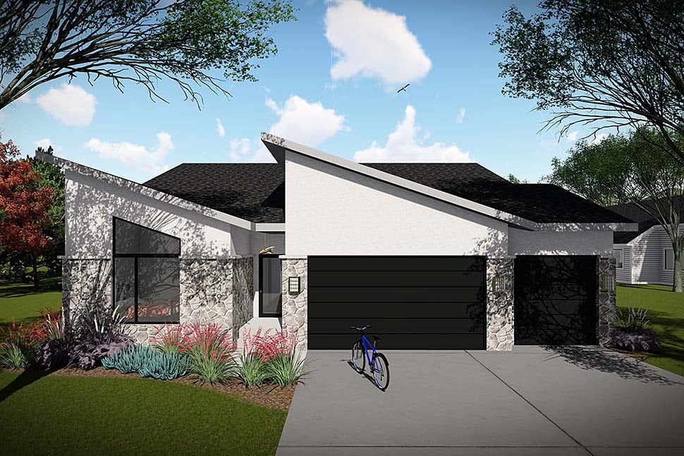 This home's exterior features everything we love about modern home plans: slopped roof, minimalist design, cool colors and stone. Inside, an open concept layout flows from the kitchen and dining area to the great room where the fireplace serves as the focal point. Off the dining area to the rear of the home is a large covered porch. The master suite is located behind the three-stall garage with a large walk-in closet and immediate access to the laundry area.