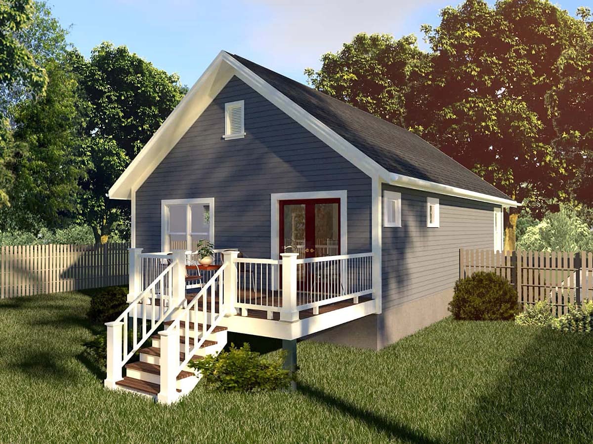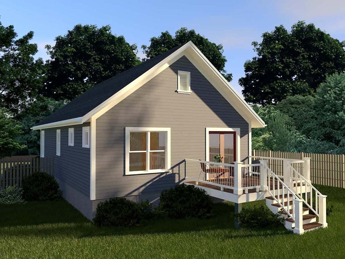 Outdoor living is encouraged with a 120 square foot porch area, perfect for outdoor meals or simply enjoying the outdoors. The compact nature of this plan makes it an ideal choice for those looking to maintain a manageable living space without sacrificing functionality and style.