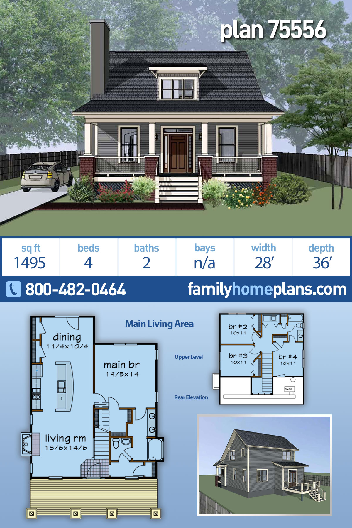 Contemporary Country Neighborhood Plan #75556 Offers 1495 sq ft, 4 bed, 2 Baths and a Covered Porch