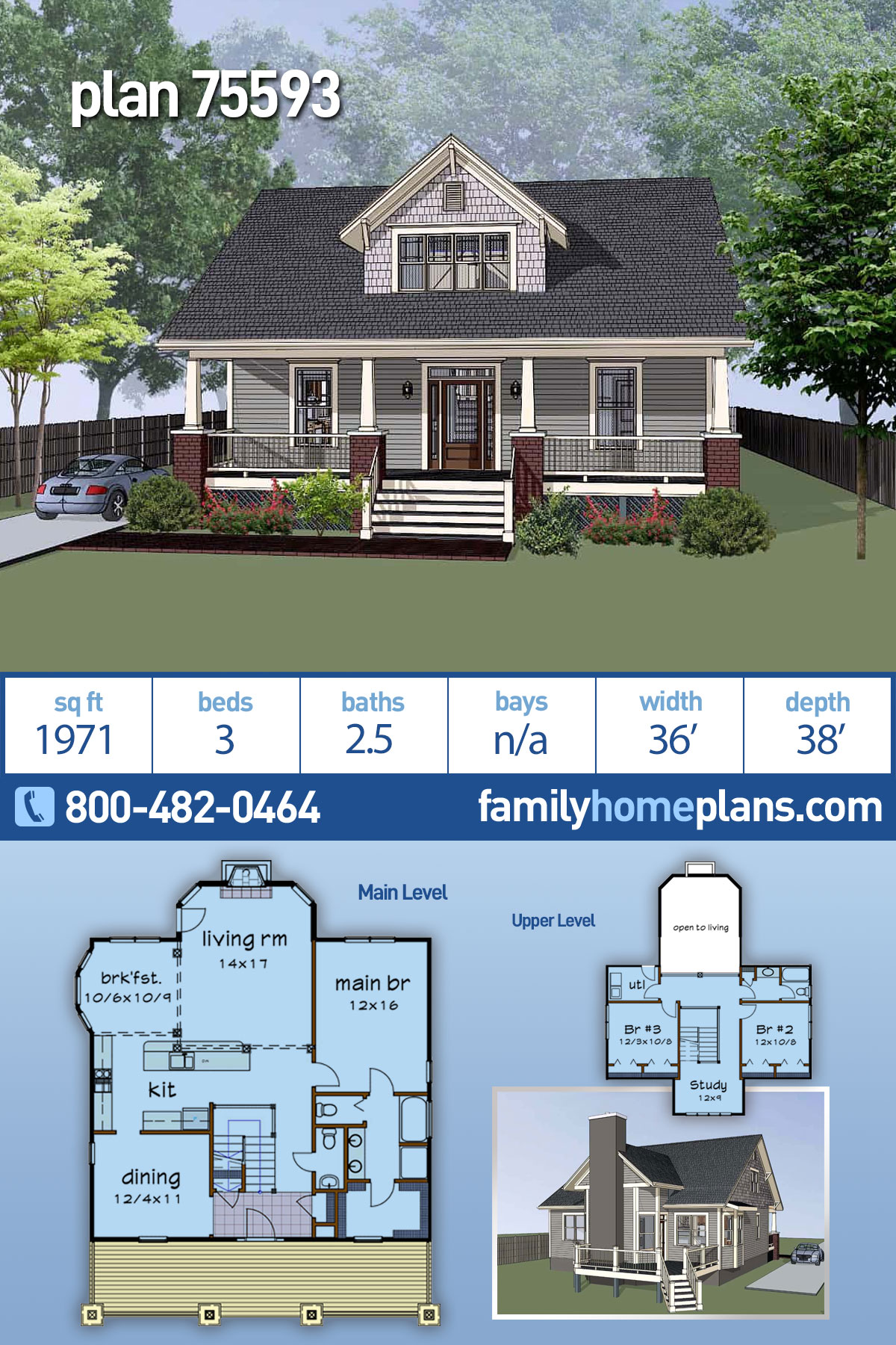 Bungalow, Cottage, Craftsman, Narrow Lot Style House Plan 75593 with 1971 Sq Ft, 3 Bed, 3 Bath