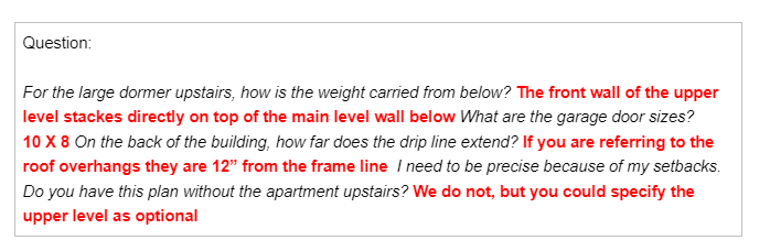 Q:For the large dormer upstairs, how is the weight carried from below? What are the garage door sizes? On the back of the building, how far does the drip line extend? I need to be precise because of my setbacks. Do you have this plan without the apartment upstairs?
