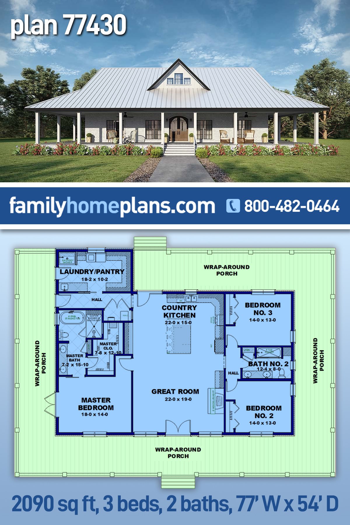 The 10-foot-deep wrap-around porch is the showstopper of this home! There is so much space for outdoor lounging. Double doors lead to the Great Room, which shares an open floor layout with the kitchen. The kitchen has a large island with seating. There is a split bedroom layout. Bedrooms 2 and 3 share a bathroom. The Master Bedroom is on the opposite side of the home, with a large bathroom with a custom shower, a freestanding bathtub, and a spacious linen closet. The closet in the master is massive and has shelves for additional storage.