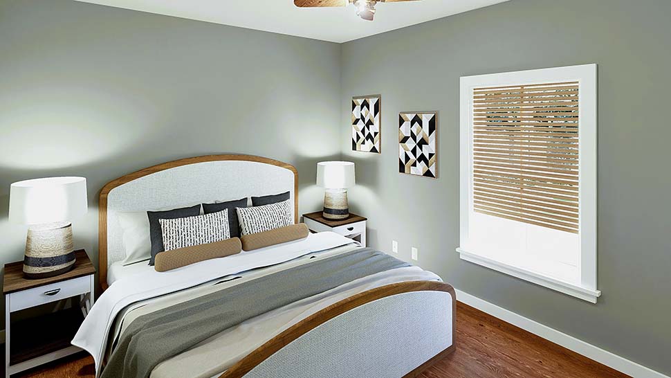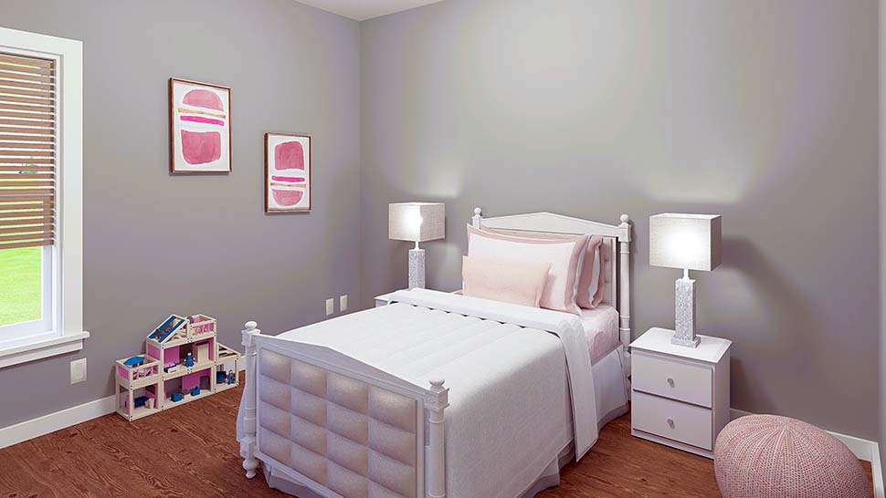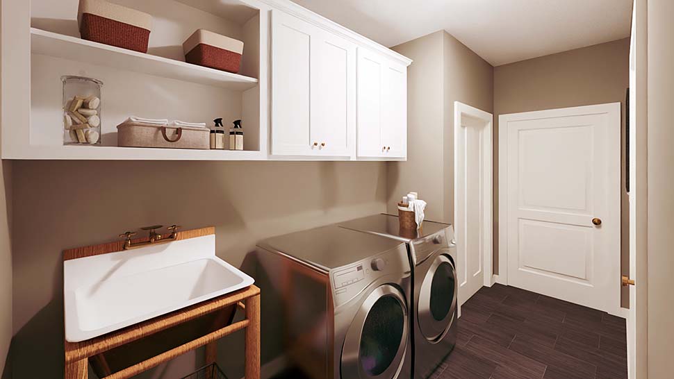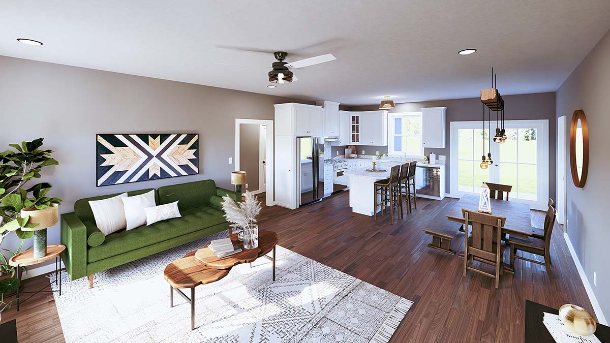 The open Kitchen/Dining and Great Room are the heart of this house plan, offering a spacious and inviting area for entertaining everyone. Whether a family dinner or a gathering with friends, this space is perfect for creating lasting memories. The Kitchen has an island with a counter-high snack bar and lots of cabinets. French doors lead out onto the optional patio, to extend living space. The large Laundry Room is designed for functionality, with plenty of storage and a laundry sink. The Master Bedroom is large and contains a private bath and walk-in closet. The Master Bath has dual sinks, a tub/shower combo, and plenty of storage. Bedrooms 2, 3, and 4 share a compartment-style bath, so more than one person can get ready at the same time.