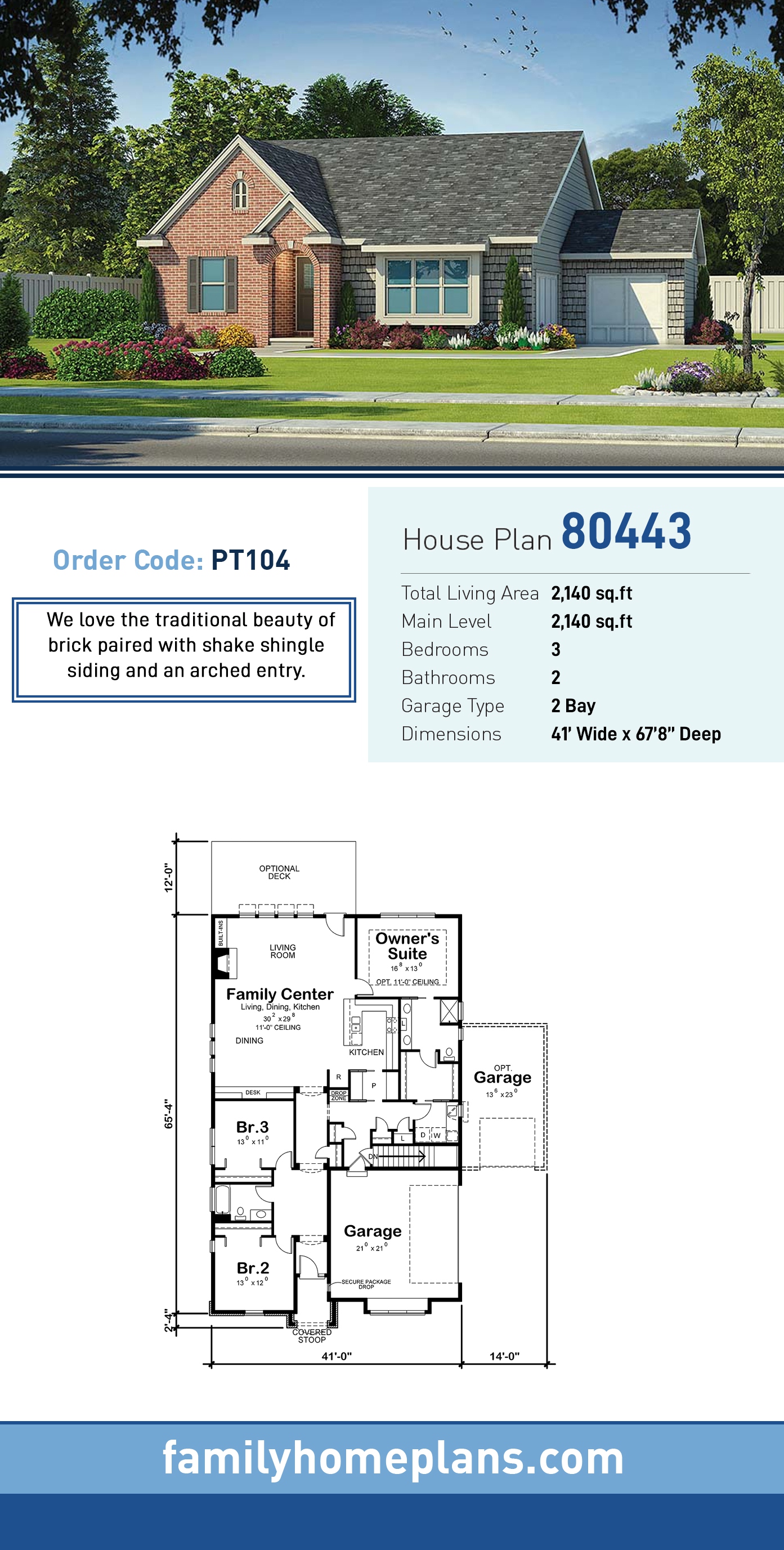 The traditional beauty of brick paired with shake shingle siding and an arched entry for this plan. Coming in from the garage, the plan offers two coat closets, a drop zone, and a convenient walk-through pantry. The kitchen presents a long snack bar as well as open dining area that can easily expand for large holiday get-togethers. There's also a built-in desk providing workspace for the project you couldn't get finished at the office. Two bedrooms to the front can be traded for a second owner's suite if that's a better solution for your household!