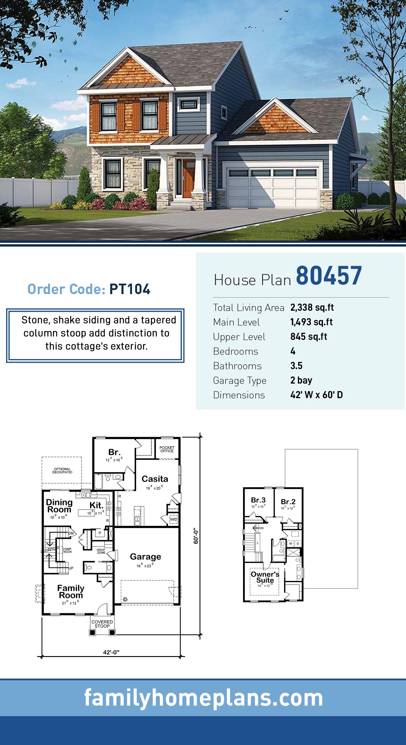 Stone, shake siding and a tapered column stoop add distinction to this cottage’s exterior. But what will delight the majority of buyers is the home’s first-floor casita tucked behind the garage. Perfect for a live-in caregiver/nanny or adult child. The casita has its own bedroom, bathroom, kitchen, entertaining space and even a pocket office for finishing up projects. The main home provides ample entertaining and daily living accommodations on the main floor. Three bedrooms, two bathrooms and the laundry room on the second floor, and there are transom windows in both the owner’s bathroom and walk-in closet for welcome natural light.