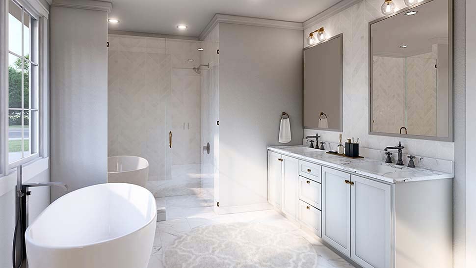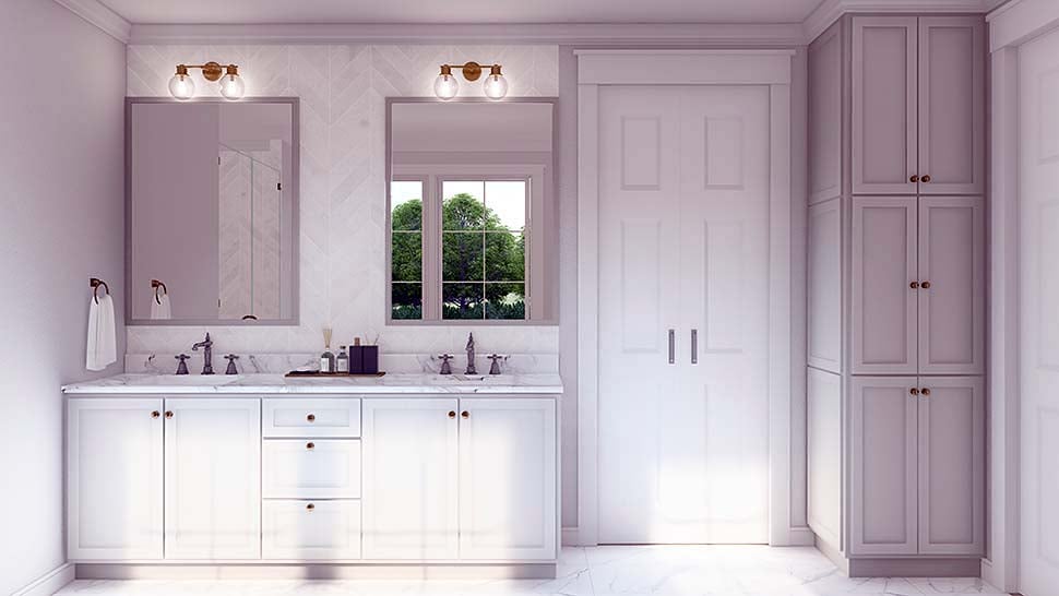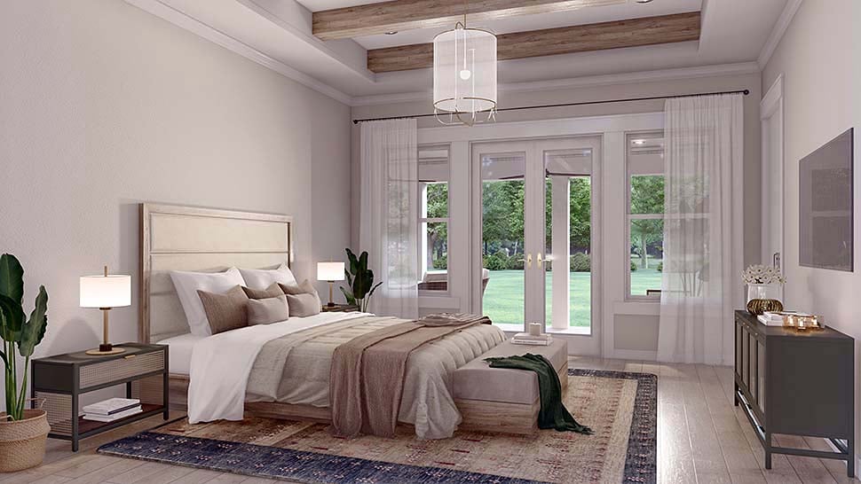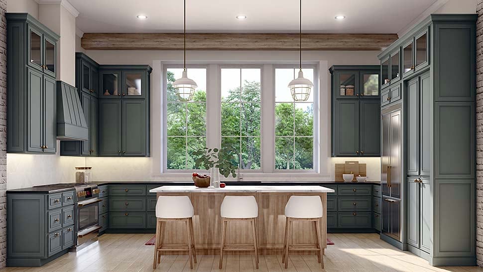 This transitional styled house plan offers 3 bedrooms, 2.5 baths and an open floor plan. The Kitchen, Dining, and Great Room are perfect spaces for a family that enjoys to entertain or spend time together. The Kitchen has an eat at bar and walk-in pantry with cabinet entry. In the Great Room you'll find built-ins next to a fireplace and vaulted ceiling with decorative wood beams and access to two separate porches. A spacious primary suite opens up onto a rear porch and is equipped with a luxurious bathroom and closet area. Other notable features include a large Entry from the Garage and home office off of the Foyer.