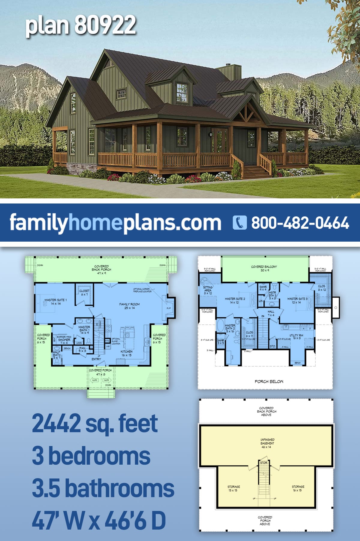 Country, Farmhouse, Ranch, Traditional Style House Plan 80922 with 2442 Sq Ft, 3 Bed, 4 Bath