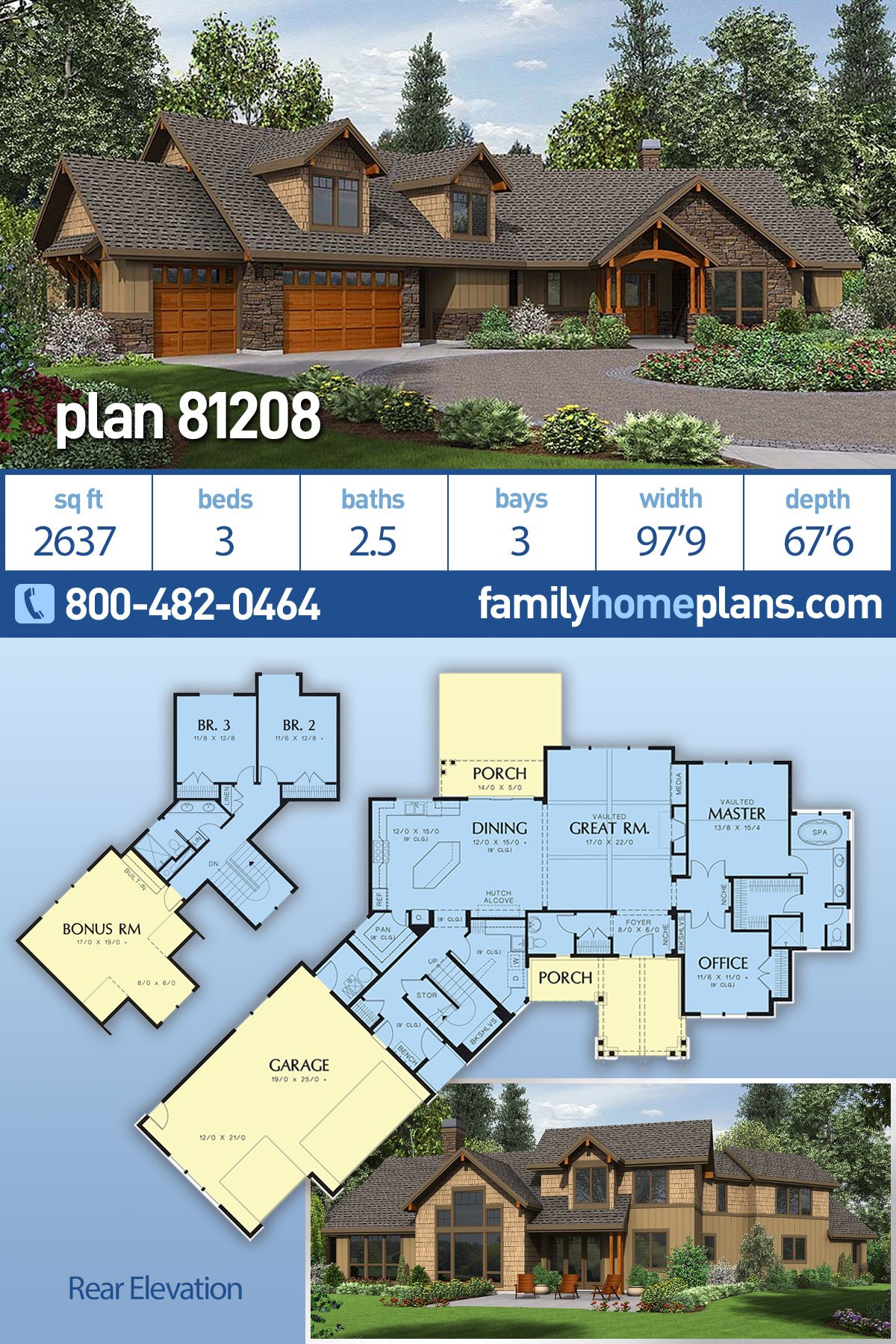 Rustic Craftsman Home Plan has Three Beds, 2.5 Bathrooms and a 2637 Sq Ft Open Floor Plan