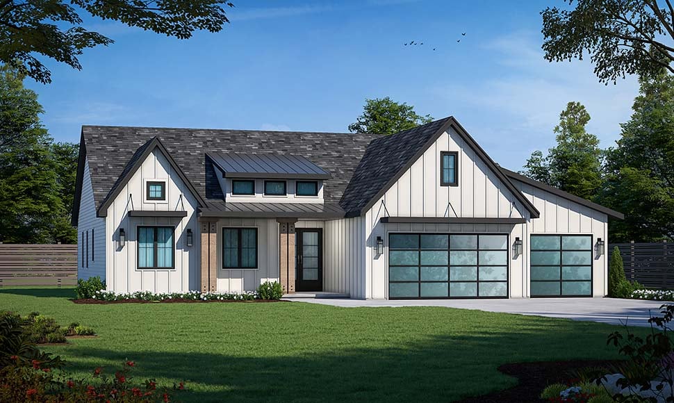 Options abound with this Modern Farmhouse’s open concept, split bedroom design. This plan’s flex room offers home-based business opportunities and additional bedroom options. The main suite’s ensuite offers a convenient connection to the laundry room. The large rear-covered deck offers outdoor living and expanded entertainment options.