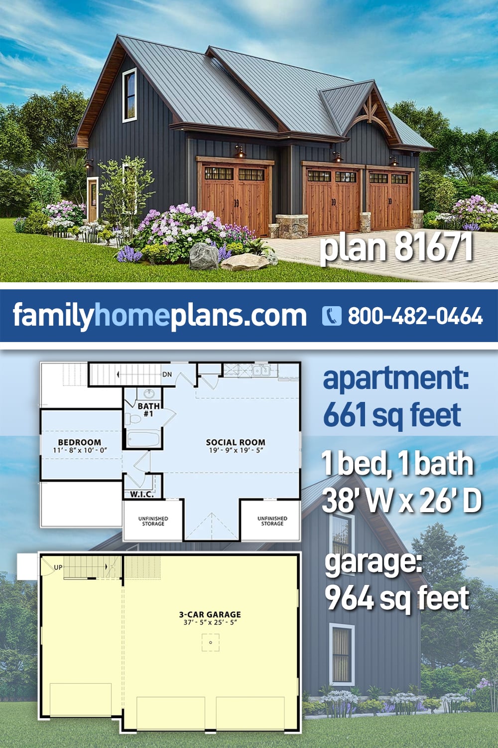 Plan 81671 | Country, Craftsman, Traditional Garage-Living with 1 Bed, 1 Bath, 3 Car