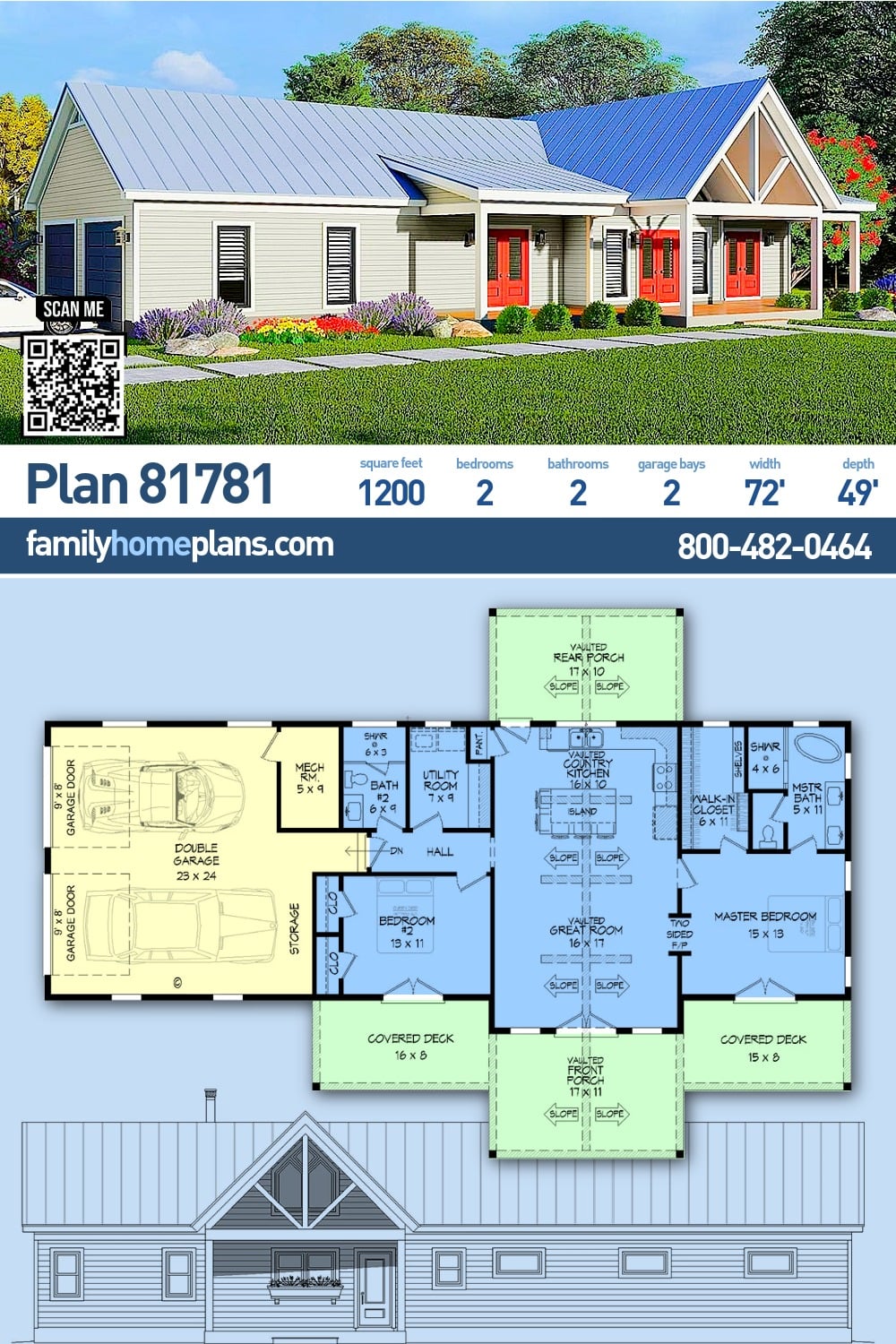 Country ranch house plan 81781 offers 2 bedroom, 2 bathroom living with 1,200 square feet designed for comfort, efficiency, and strong indoor outdoor connection.