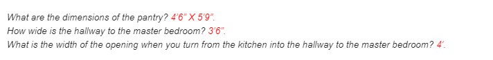 Q:What are the dimensions of the pantry? How wide is the hallway to the master bedroom? What is the width of the opening when you turn from the kitchen into the hallway to the master bedroom?