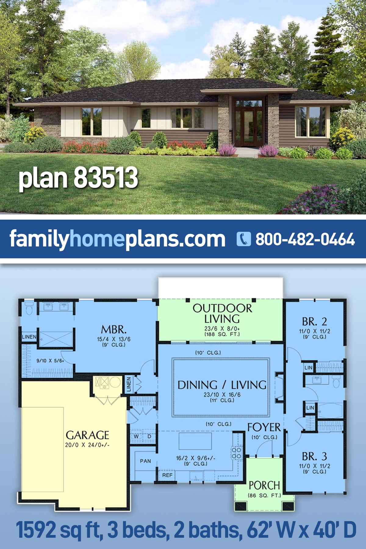 Plan 83513 | Contemporary, Modern, Prairie, Ranch House with 3 Bed, 2 Bath, 2 Car