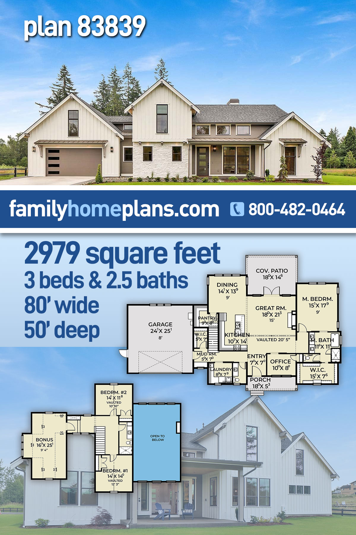 Contemporary Farmhouse Plan with Bonus Room – 2,979 Sq Ft, 3 Bed, 3 Bath