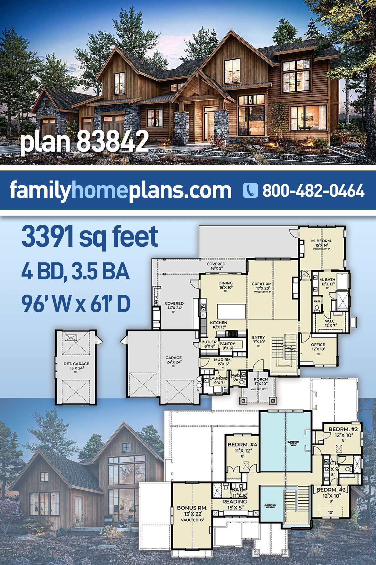 The Mountain Lodge House Plan With Bonus Detached Garage (Plan 83842) offers 3,391 sq. ft. of rustic luxury with 4 bedrooms and 3.5 bathrooms. Its striking exterior features rich wood siding, stone accents, and a welcoming vaulted front porch. Inside, a grand vaulted great room with a fireplace opens seamlessly to the dining area and chef’s kitchen, complete with a large island, walk-in pantry, and butler’s pantry leading to the attached two-car garage. The main-level master suite boasts a vaulted ceiling, spa-style bath, and huge walk-in closet, while an office and covered patio with outdoor kitchen potential enhance convenience. Upstairs includes three bedrooms, a vaulted bonus room, and reading nook. Lastly, we have a detached third garage bay for extra flexibility.