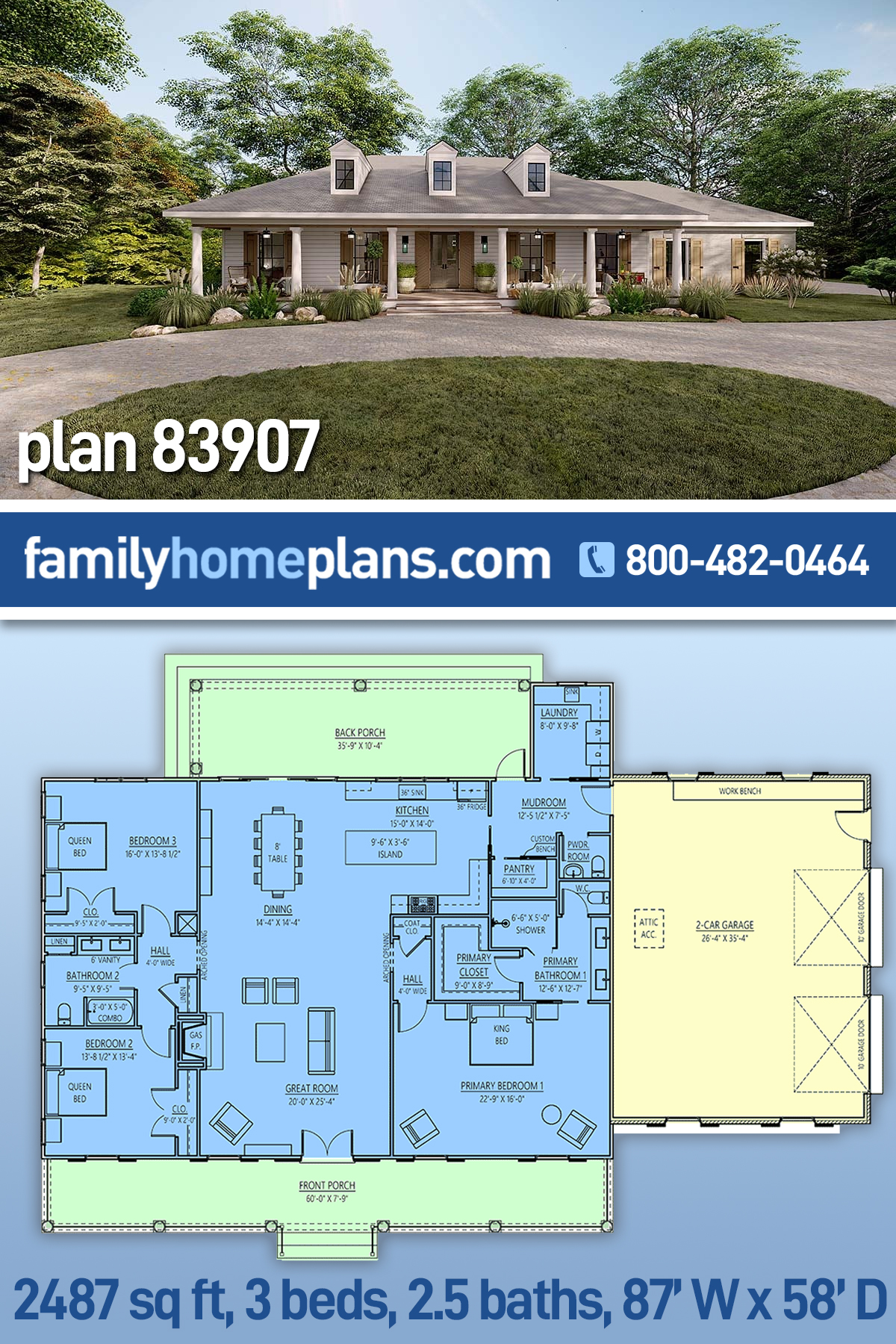 Southern Style, 2487 Sq Ft, 3 Bed, 3 Bath, 2 Car | Plan 83907