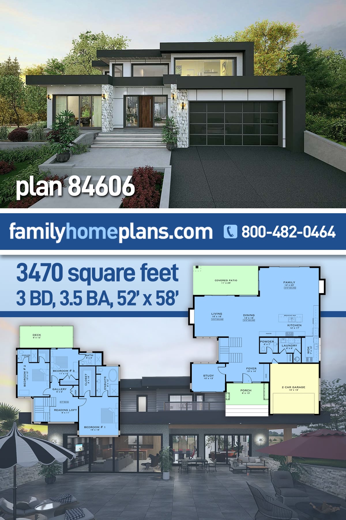 Contemporary House Plan With Second Story Deck #84606 is 3,470 sq ft of living space, 3 bedrooms, and 3.5 bathrooms. The main level offers not only an open and spacious family - living - kitchen - dining room, but there's even a dedicated study next to the wide front foyer. All 3 bedrooms are upstairs, and Bed 1 has a large walk in closet and bathroom with double sink, shower, and soaking tub. Beds 2 & 3 each have their own bathroom, and all will enjoy the cozy reading loft on this level.