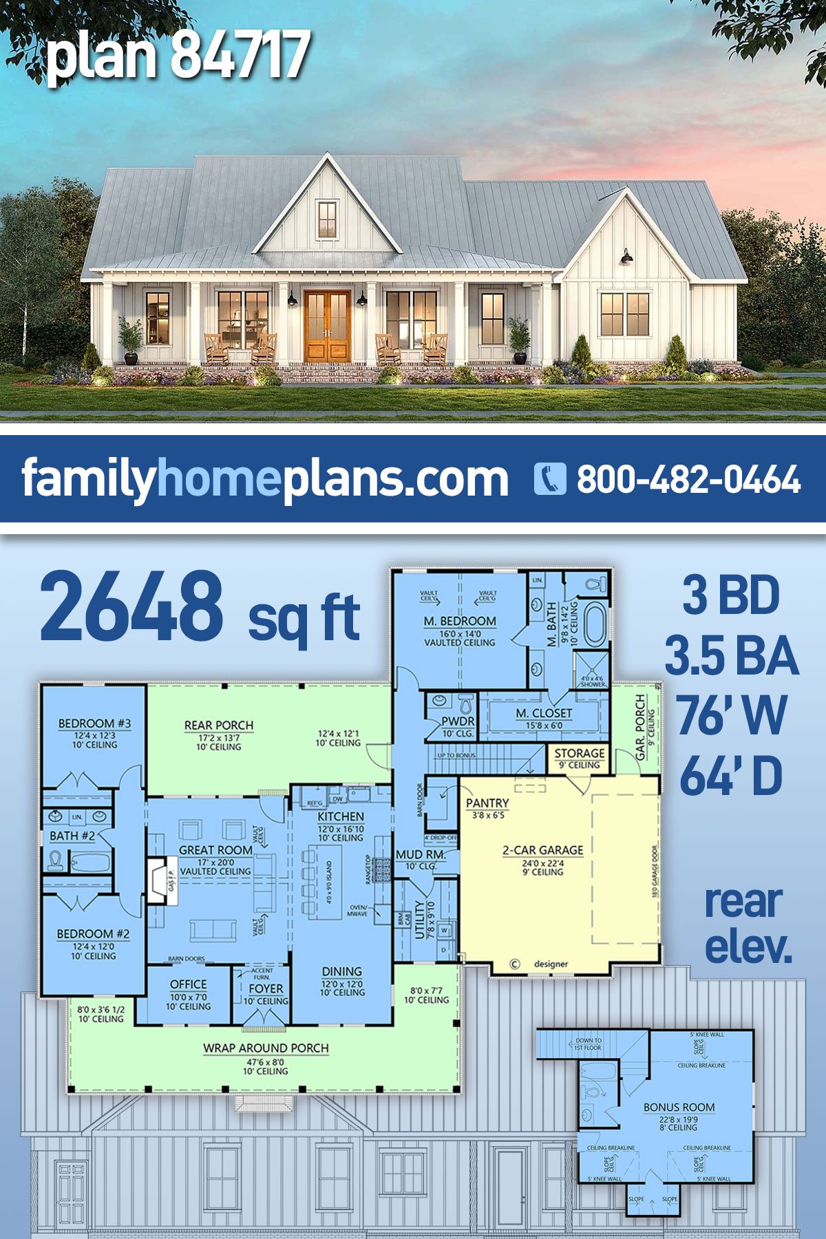 Plan 84717 | Country, Farmhouse, New American House with 3 Bed, 4 Bath, 2 Car