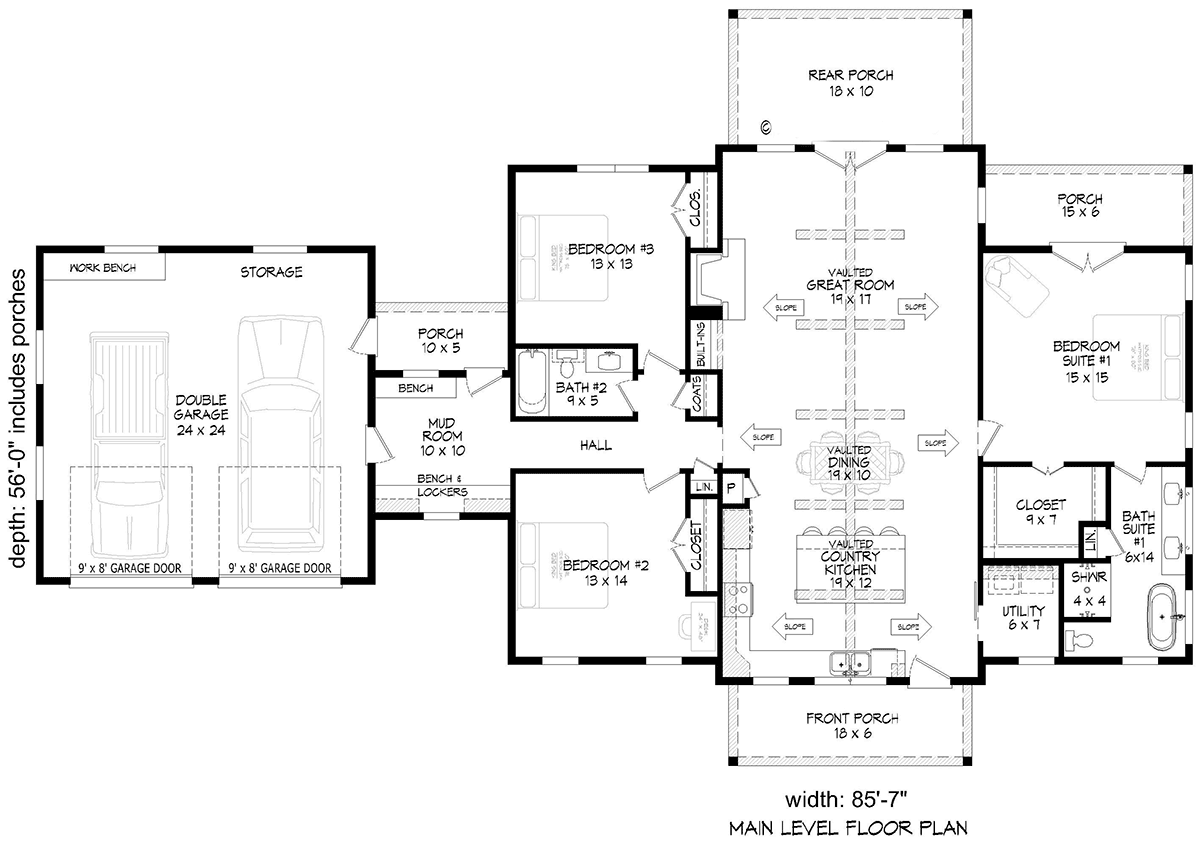 Country Style, 1952 Sq Ft, 3 Bed, 2 Bath, 2 Car | Plan 84855