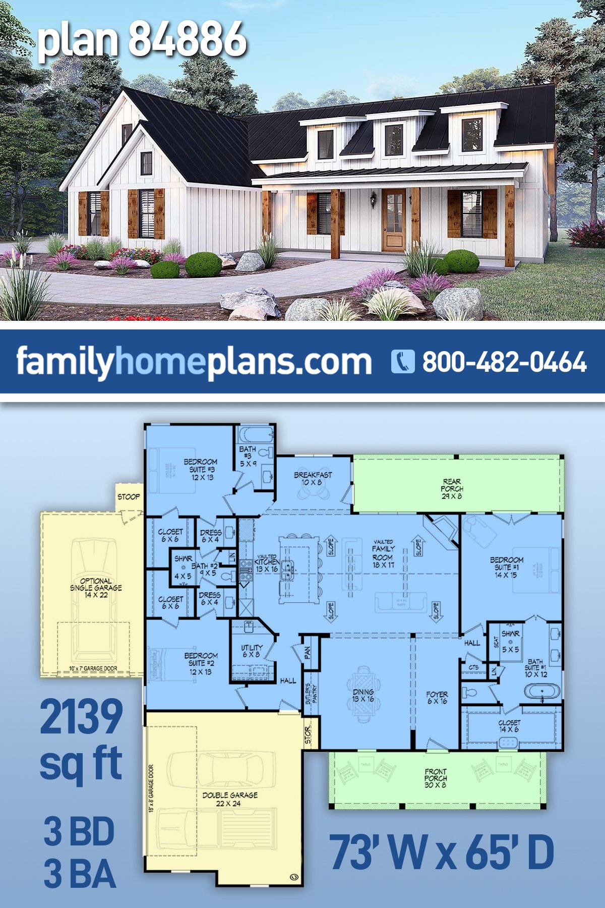 This popular Ranch Farmhouse Plan is a great example of a one-story Ranch floorplan, and Farmhouse style is seen in the white vertical siding, knotty wooden shutters, and 3 charming dormers. This plan is comfortable with 2139 sq ft of living space, 3 beds, 3 baths and a 2 bay garage. Walk inside to appreciate the designated dining space and open living space among family room, kitchen, and breakfast area. Families will gather around the oversized kitchen island or grill out on the back porch.