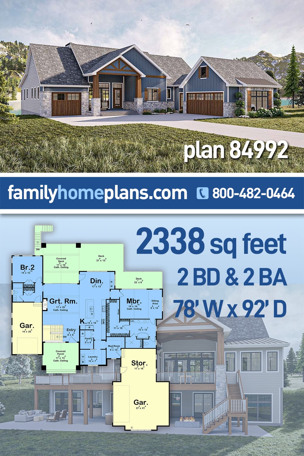 Craftsman Lakeside House Plan 84992 | 2 Bed 2 Bath with 3 Car Garage