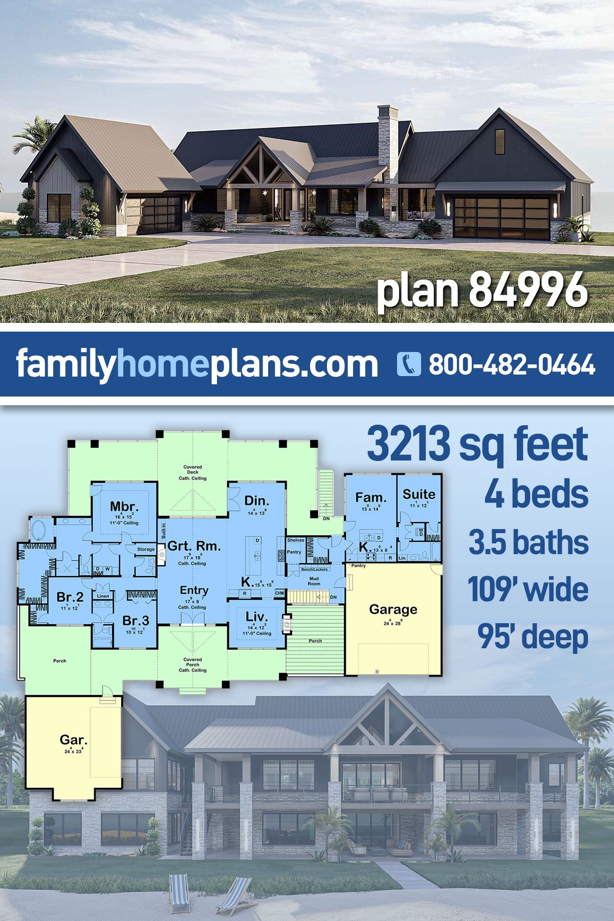 Looking for a lake house that gives you the modern farmhouse feel? This home plan would be perfect for your dream build. This exterior with the board and batten in combination with stone makes this space have a unique curb appeal, while also providing that modern aspect. Along the backside of the property, there is a massive two-story deck that would allow for incredible views of the water, sunset, or even the beautiful landscape around you.