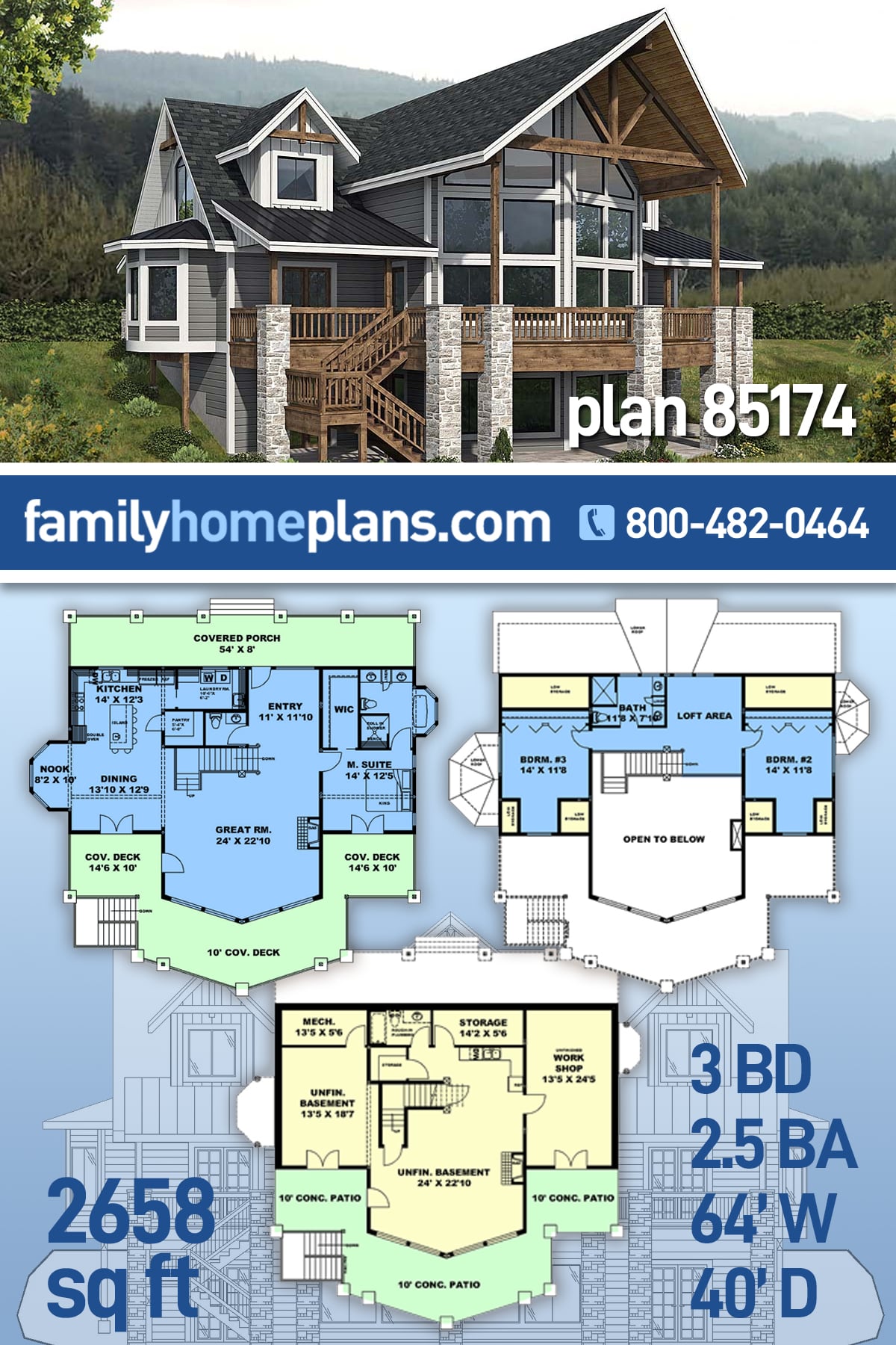 Build 2658 sq ft Hillside House Plan With Huge Windows because it offers a great view of your property through floor to ceiling windows in the great room. Enjoy that view from outside too because of the huge covered deck. The main level master suite has a big closet, bay window, and French door access to the deck. Another bay window adds natural light and charm in the dining area. 2 more bedrooms and a loft are upstairs, and the WOB is available if you want to finish the space for more fun.
