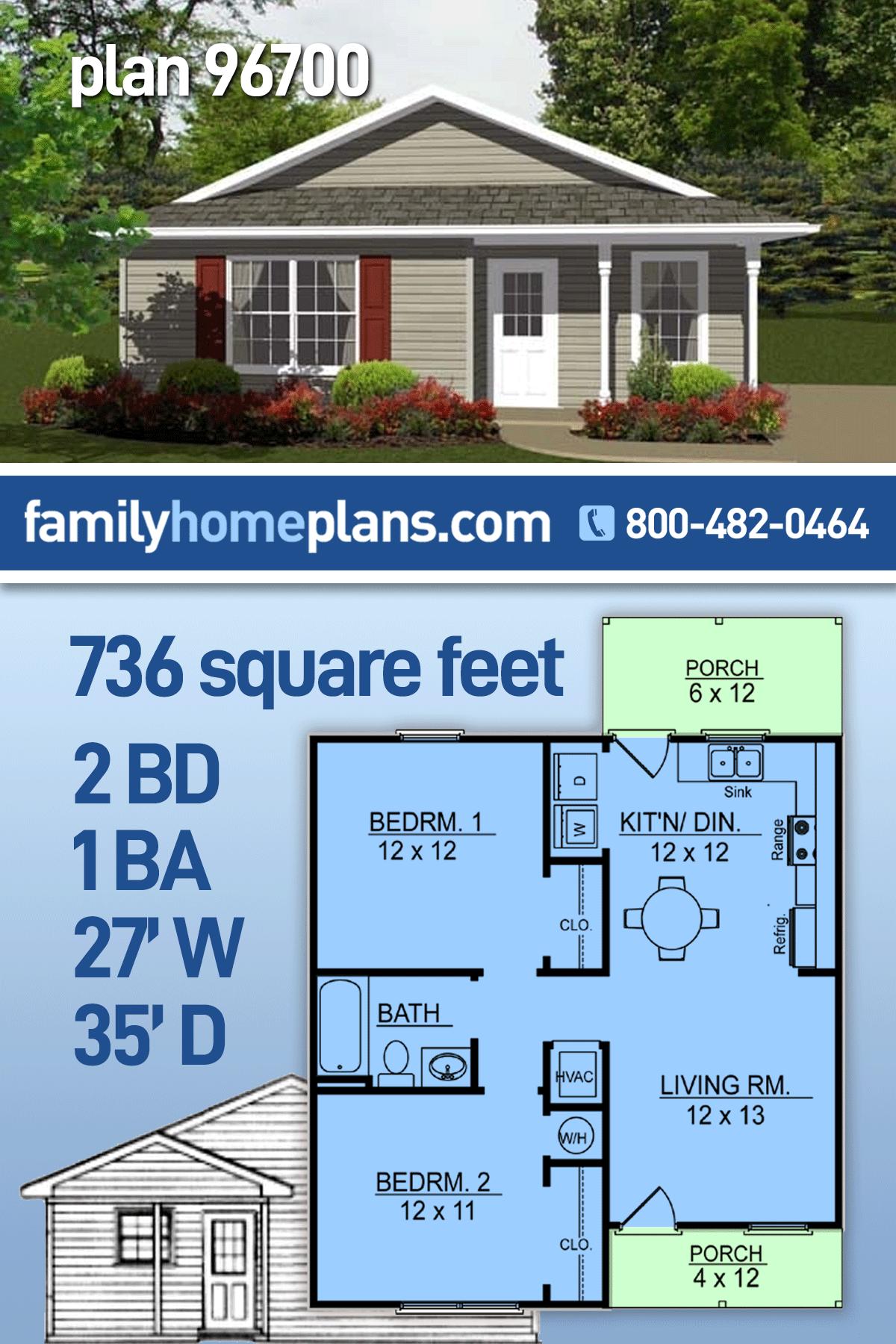 Traditional House Plan 96700 with 736 Sq Ft, 2 Bed, 1 Bath